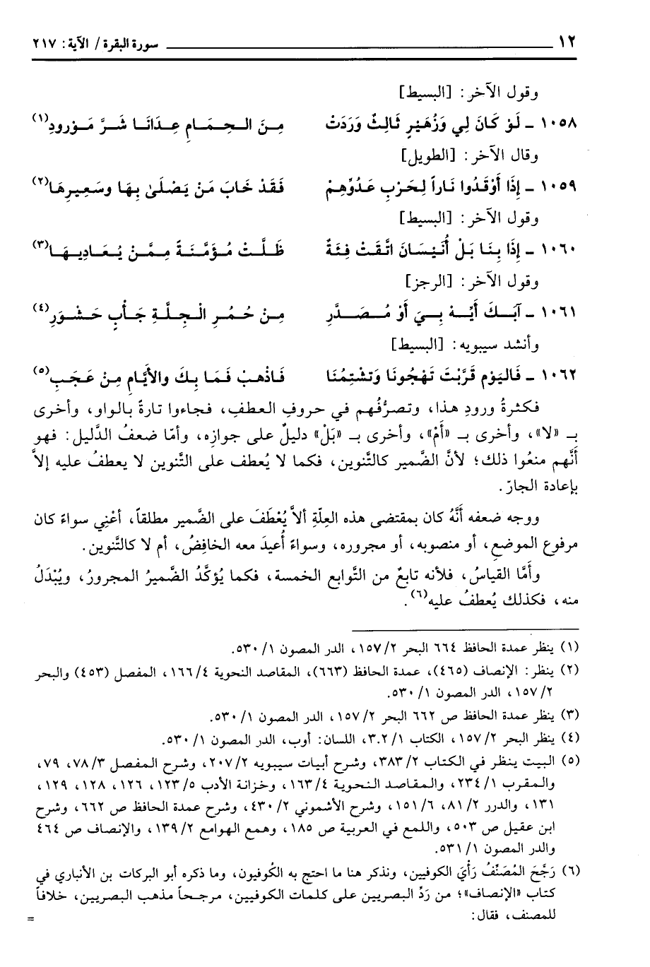 فكثرةُ ورودِ هذا، وتصرُّفُهم في حروفِ العطفِ، فجاءوا تارةً بالواو، وأخرى ب «لا» ، وأخرى ب «أَمْ» ، وأخرى ب «بَلْ» دليلٌ على جوازِه، وأمَّا ضعفُ الدَّليل: فهو أَنَّهم منعُوا ذلك؛ لأنَّ الضَّمير كالتَّنوين، فكما لا يُعطف على التَّنوين لا يعطفُ عليه إلاَّ بإعادة الجارّ.