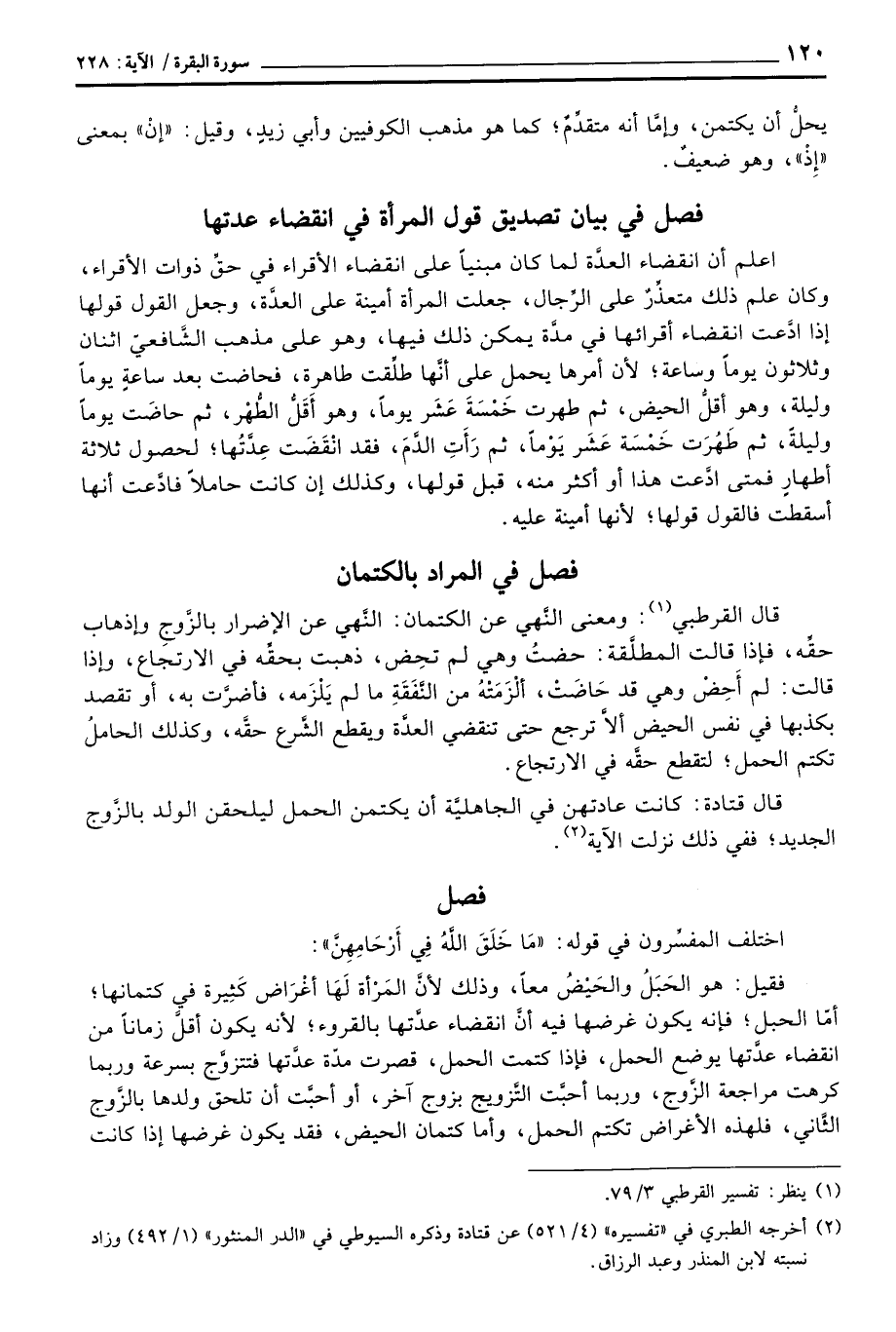 قال القرطبي: ومعنى النَّهي عن الكتمان: النَّهي عن الإضرار بالزَّوجِ وإذهاب حقِّه، فإذا قالت المطلَّقة: حضتُ وهي لم تحِض، ذهبت بحقِّه في الارتجاع، وإذا قالت: لم أَحِضْ وهي قد حَاضَتْ، ألْزَمَتْهُ من النَّفَقَةِ ما لم يَلْزَمه، فأضرَّت به، أو تقصد بكذبها في نفس الحيض ألاَّ ترجع حتى تنقضي العدَّة ويقطع الشَّرع حقَّه، وكذلك الحاملُ تكتم الحمل؛ لتقطع حقَّه في الارتجاع.