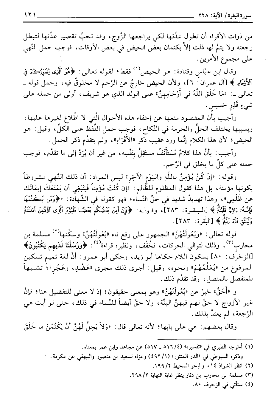 قوله تعالى: {وَبُعُولَتُهُنَّ} الجمهور على رفع تاء «بُعُولَتُهُنَّ» وسكَّنها مسلمة بن محاربٍ، وذلك لتوالي الحركات، فخُفِّف، ونظيره قراءة: {وَرُسُلُنَا لَدَيْهِمْ يَكْتُبُونَ} [الزخرف: 80] بسكون اللام حكاها أبو زيد، وحكى أبو عمرو: أنَّ لغة تميم تسكين المرفوع من «يُعَلِّمُهُمُ» ونحوه، وقيل: أجرى ذلك مجرى «عَضُدٍ، وعَجُزٍ» ؛ تشبيهاً للمنفصل بالمتصل، وقد تقدَّم ذلك.