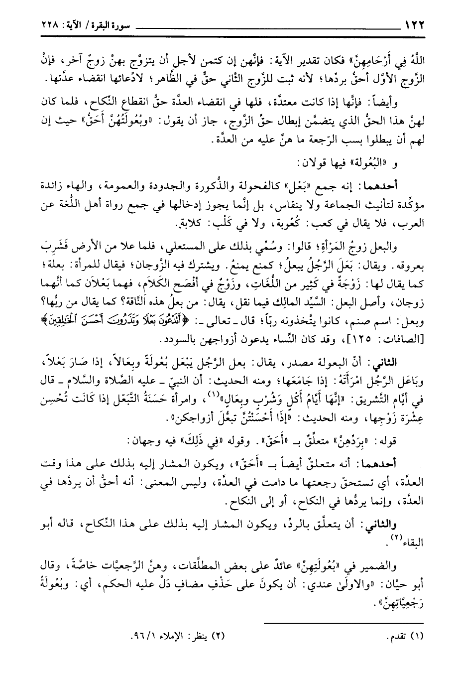 والضمير في «بُعُولَتِهِنَّ» عائدٌ على بعض المطلَّقات، وهنَّ الرَّجعيَّات خاصَّةً، وقال أبو حيَّان: «والاولَى عندي: أن يكونَ على حَذْفِ مضافٍ دَلَّ عليه الحكم، أي: وبُعُولَةُ رَجْعِيَّاتِهِنَّ» .