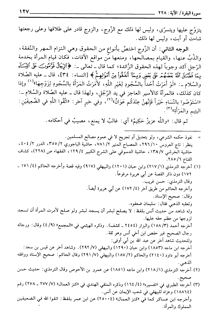 الوجه الثاني: أن الزَّوج اختصَّ بأنواعٍ من الحقوق وهي التزام المهر والنَّفقة والذَّبُّ عنها، والقيام بمصالحها، ومنعها من مواقع الآفات، فكان قيام المرأة بخمة الرَّجل آكد وجوباً لهذه الحقوق الزَّائدة؛ كما قال - تعالى -: {الرجال قَوَّامُونَ عَلَى النسآء بِمَا فَضَّلَ الله بَعْضَهُمْ على بَعْضٍ وَبِمَآ أَنْفَقُواْ مِنْ أَمْوَالِهِمْ} [النساء: 34] ، قال - عليه الصَّلاة والسَّلام -: «لَوْ أَمَرْتُ أَحْداً بالسُّجُودِ لِغَيْرِ الله، لأَمَرْتُ المَرْأَةَ بالسُّجُودِ لِزَوْجِهَا» وإذا كان كذلك، فالمرأة كالأسير العاجز في يد الرَّجُلِ، ولهذا قال - عليه الصَّلاة والسَّلام -: «اسْتَوْصُوا بِالنِّسَاءِ خَيْراً فَإِنَّهُنَّ عِنْدَكُم عَوَانٌ» ، وفي خبرٍ آخر: «اتَّقُوا الله في الضَّعِيفَيْن: اليتيمِ والمَرْأَةِ» .