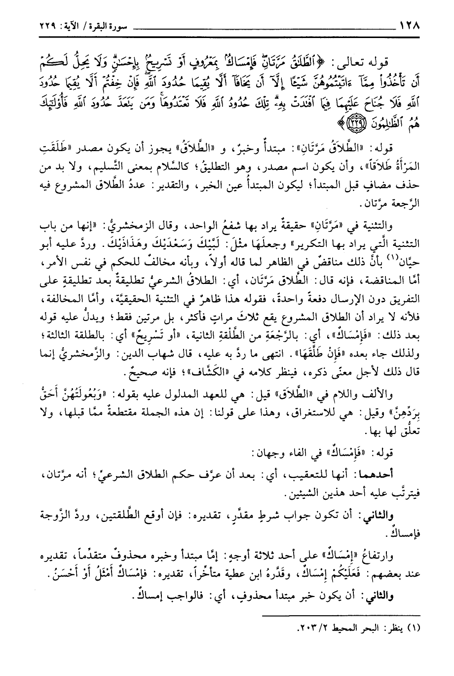 والتثنية في «مَرَّتَانِ» حقيقةٌ يراد بها شفعُ الواحد، وقال الزمخشريُّ: «إنها من باب التثنية الَّتي يراد بها التكرير» وجعلَهَا مثْلَ: لَبَّيْكَ وَسَعْدَيْكَ وَهَذَا ذَيْكَ. وردَّ عليه أبو حيَّان بأنَّ ذلك مناقضٌ في الظاهر لما قاله أولاً، وبأنه مخالفٌ للحكم في نفس الأمر، أمَّا المناقضة، فإنه قال: الطَّلاق مَرَّتَان، أي: الطلاقُ الشرعيُّ تطليقةٌ بعد تطليقةٍ على التفريق دون الإرسال دفعةً واحدةً، فقوله هذا ظاهرٌ في التثنية الحقيقيّة، وأمَّا المخالفة، فلأنه لا يراد أن الطلاق المشروع بقع ثلاثَ مراتٍ فأكثر، بل مرتين فقط؛ ويدلُّ عليه قوله بعد ذلك: {فَإِمْسَاكٌ} ، أي: بالرَّجْعَةِ من الطَّلْقَةِ الثانية، {أَوْ تَسْرِيحٌ} أي: بالطلقة الثالثة؛ ولذلك جاء بعده «فَإِنْ طَلَّقَهَا» . انتهى ما ردَّ به عليه، قال شهاب الدين: والزَّمخشريُّ إنما قال ذلك لأجل معنًى ذكره، فينظر كلامه في «الكَشَّاف» ؛ فإنه صحيحٌ.