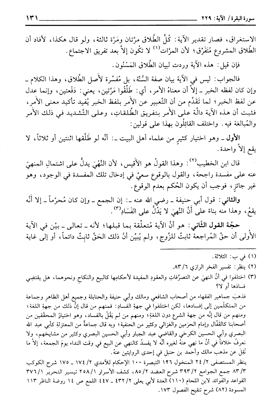 فالجواب: ليس في الآية بيان صفة السُّنَّة، بل مُفسَّرة لأَصل الطَّلاق، وهذا الكلام - وإن كان لفظه الخبر - إلاَّ أن معناهُ الأمر، أي: طَلِّقُوا مَرَّتَين، يعني: دَفْعتين، وإنما عدل عن لفظ الخبر؛ لما تَقَدَّم من أن التَّعبير عن الأَمر بلفظ الخبر يُفيد تأكيد معنى الأَمر، فثبت أن هذه الآية دالَّة على الأَمر بتفريق الطَّلقاتِ، وعلى التَّشديد في ذلك الأَمر والمُبالغة فيه. واختلف القائِلُون بهذا على قولين: