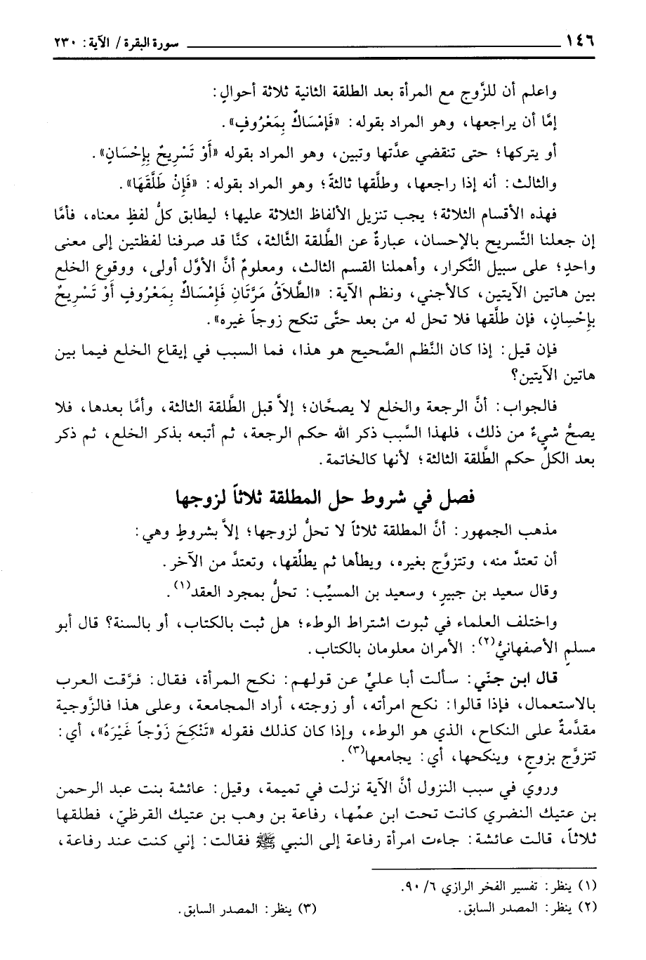 فهذه الأقسام الثلاثة؛ يجب تنزيل الألفاظ الثلاثة عليها؛ ليطابق كلُّ لفظٍ معناه، فأمَّا إن جعلنا التَّسريح بالإحسان، عبارةٌ عن الطَّلقة الثَّالثة، كنَّا قد صرفنا لفظتين إلى معنى واحدٍ؛ على سبيل التِّكرار، وأهملنا القسم الثالث، ومعلومٌ أنَّ الأوَّل أولى، ووقوع الخلع بين هاتين الآيتين، كالأجنبي، ونظم الآية: «الطَّلاَقُ مَرَّتَانِ فَإِمْسَاكٌ بِمَعْرُوفٍ أَوْ تَسْرِيحٌ بِإِحْسَانٍ، فإن طلَّقها فلا تحل له من بعد حتَّى تنكح زوجاً غيره» .