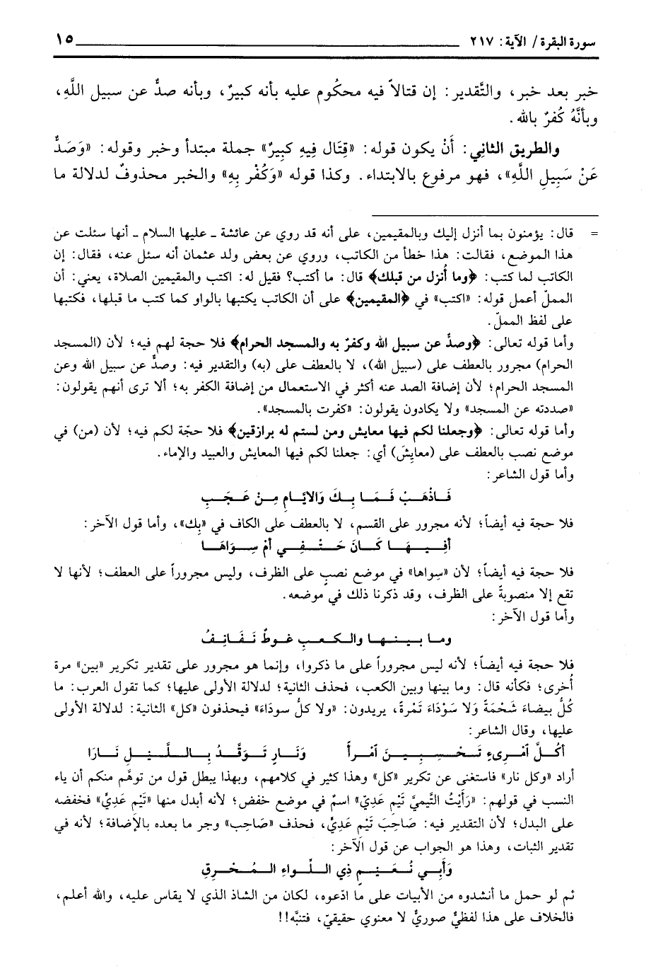 والطريق الثانِي: أَنْ يكون قوله: {قِتَالٌ فِيهِ كَبِيرٌ} جملة مبتدأ وخبر وقوله: {وَصَدٌّ عَن سَبِيلِ الله} ، فهو مرفوع بالابتداء. وكذا قوله {وكُفْرٌ بِهِ} والخبر محذوفٌ لدلالة ما