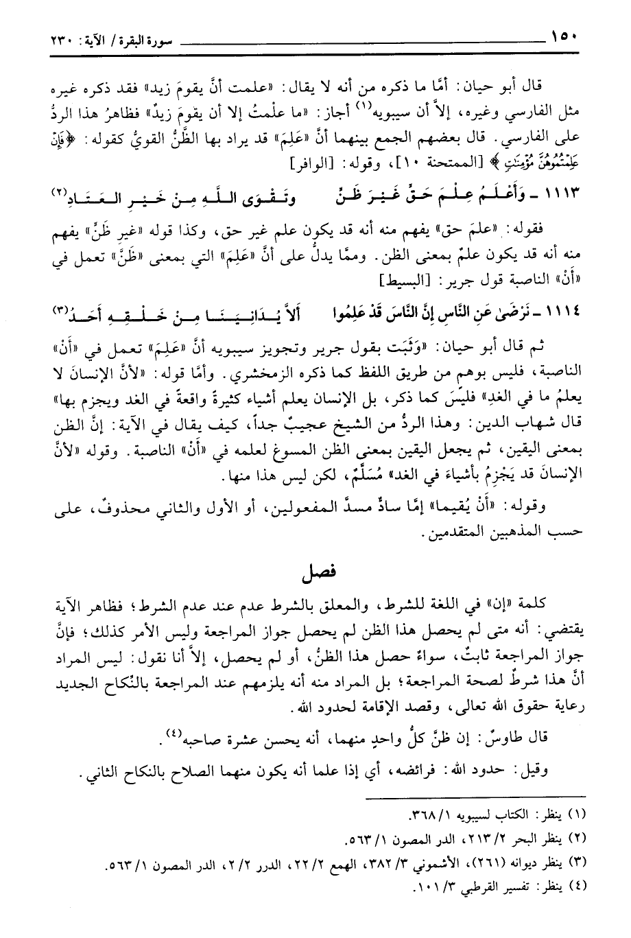 كلمة» إن «في اللغة للشرط، والمعلق بالشرط عدم عند عدم الشرط؛ فظاهر الآية يقتضي: أنه متى لم يحصل هذا الظن لم يحصل جواز المراجعة وليس الأمر كذلك؛ فإنَّ جواز المراجعة ثابتٌ، سواءٌ حصل هذا الظنُّ، أو لم يحصل، إلاَّ أنا نقول: ليس المراد أنَّ هذا شرطٌ لصحة المراجعة؛ بل المراد منه أنه يلزمهم عند المراجعة بالنِّكاح الجديد رعاية حقوق الله تعالى، وقصد الإقامة لحدود الله.