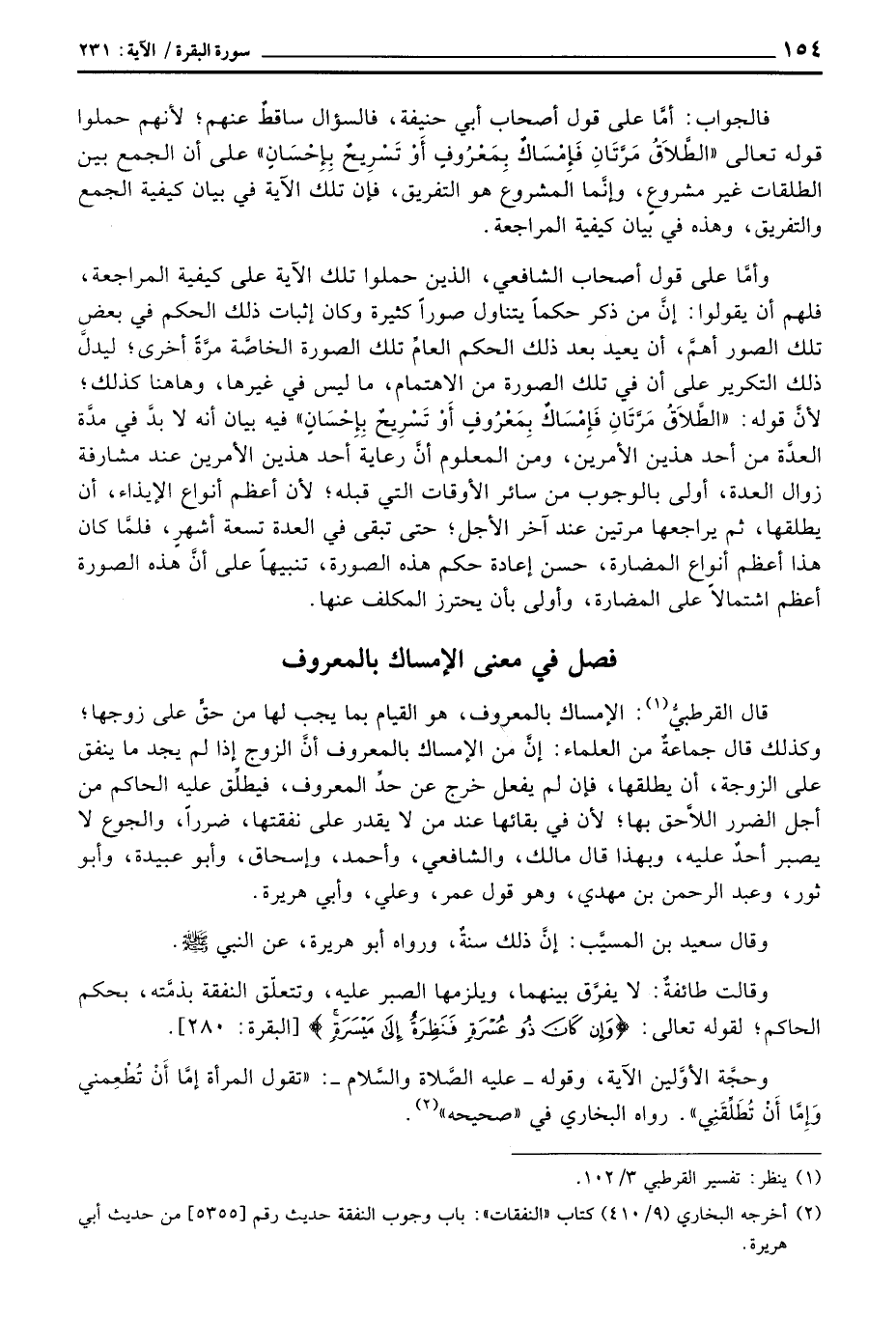 وأمَّا على قول أصحاب الشافعي، الذين حملوا تلك الآية على كيفية المراجعة، فلهم أن يقولوا: إنَّ من ذكر حكماً يتناول صوراً كثيرة وكان إثبات ذلك الحكم في بعض تلك الصور أهمَّ، أن يعيد بعد ذلك الحكم العامِّ تلك الصورة الخاصَّة مرَّةً أخرى؛ ليدلَّ ذلك التكرير على أن في تلك الصورة من الاهتمام، ما ليس في غيرها، وها هنا كذلك؛ لأن قوله: {الطلاق مَرَّتَانِ فَإِمْسَاكٌ بِمَعْرُوفٍ أَوْ تَسْرِيحٌ بِإِحْسَانٍ} [البقرة: 229] فيه بيان أنه لا بدَّ في مدّضة العدَّة من أحد هذين الأمرين، ومن المعلوم أنَّ رعاية أحد هذين الأمرين عند مشارفة زوال العدة، أولى بالوجوب من سائر الأوقات التي قبله؛ لأن أعظم أنواع الإيذاء، أن يطلقها، ثم يراجعها مرتين عند آخر الأجل؛ حتى تبقى في العدة تسعة أشهرٍ، فلمَّا كان هذا أعظم أنواع المضارة، حسن إعادة حكم هذه الصورة، تنبيهاً على أنّض هذه الصورة أعظم اشتمالاً على المضارة، وأولى بأن يحترز المكلف عنها.