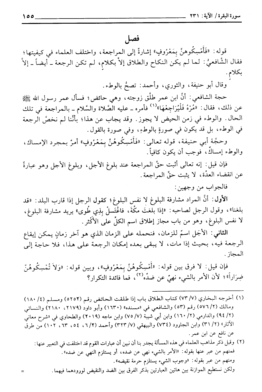 قوله: {فَأَمْسِكُوهُنَّ بِمَعْرُوفٍ} إشارةٌ إلى المراجعة، واختلف العلماء في كيفيتها؛ فقال الشَّافعيُّ: لما لم يكن النكاح والطلاق إلاَّ بكلامٍ، لم تكن الرجعة - أيضاً - إلاَّ بكلامٍ.