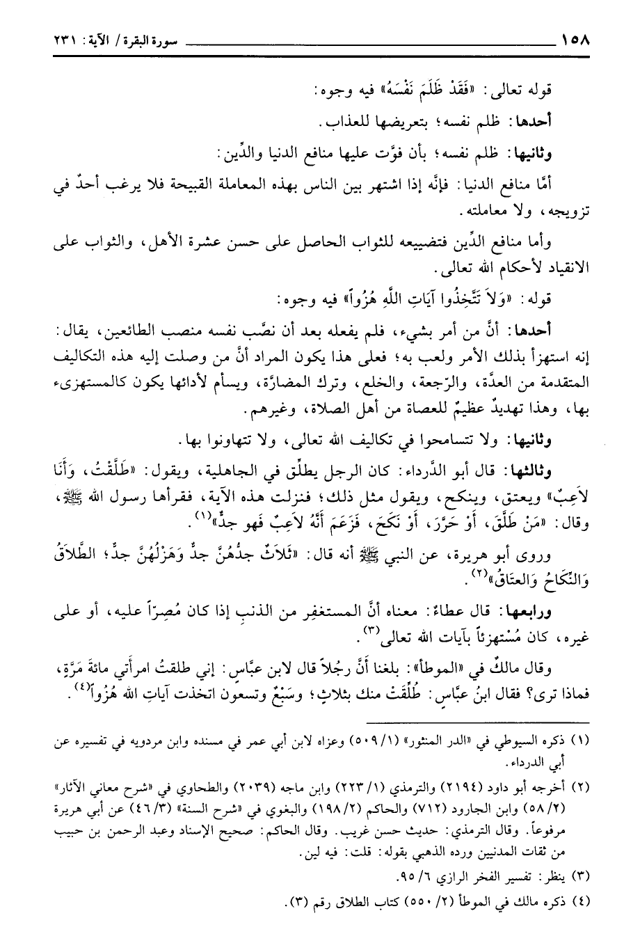 وثالثها: قال أبو الدَّرداء: كان الرجل يطلِّق في الجاهلية، ويقول: «طَلَّقْتُ، وَأَنَا لاَعِبٌ» ويعتق، وينكح، ويقول مثل ذلك؛ فنزلت هذه الآية، فقرأها رسول الله صَلَّى اللَّهُ عَلَيْهِ وَسَلَّم َ، وقال: «مَنْ طَلَّقَ، أَوْ حَرَّرَ، أَوْ نَكَحَ، فَزَعَمَ أَنَّهُ لاَعِبٌ فَهو جدٌّ» .