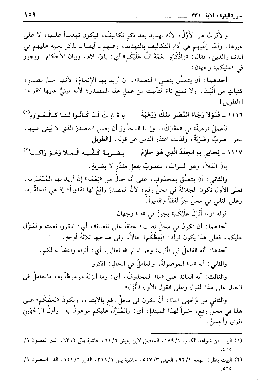 والأَقربُ هو الأَوَّلُ؛ لأنه تهديد بعد ذكرِ تكاليفَ، فيكون تهدِيداً عليها، لا على غيرها. ولمَّا رَغَّبهم في أداءِ التكاليف بالتهديد، رغبهم - أيضاً - بذكر نعمِهِ عليهم في الدنيا والدين، فقال: «واذْكُرُوا نِعْمَةَ اللهِ عَلَيْكُم» أي: بالإسلام، وبيان الأَحكام. ويجوز في «عليكم» وجهان: