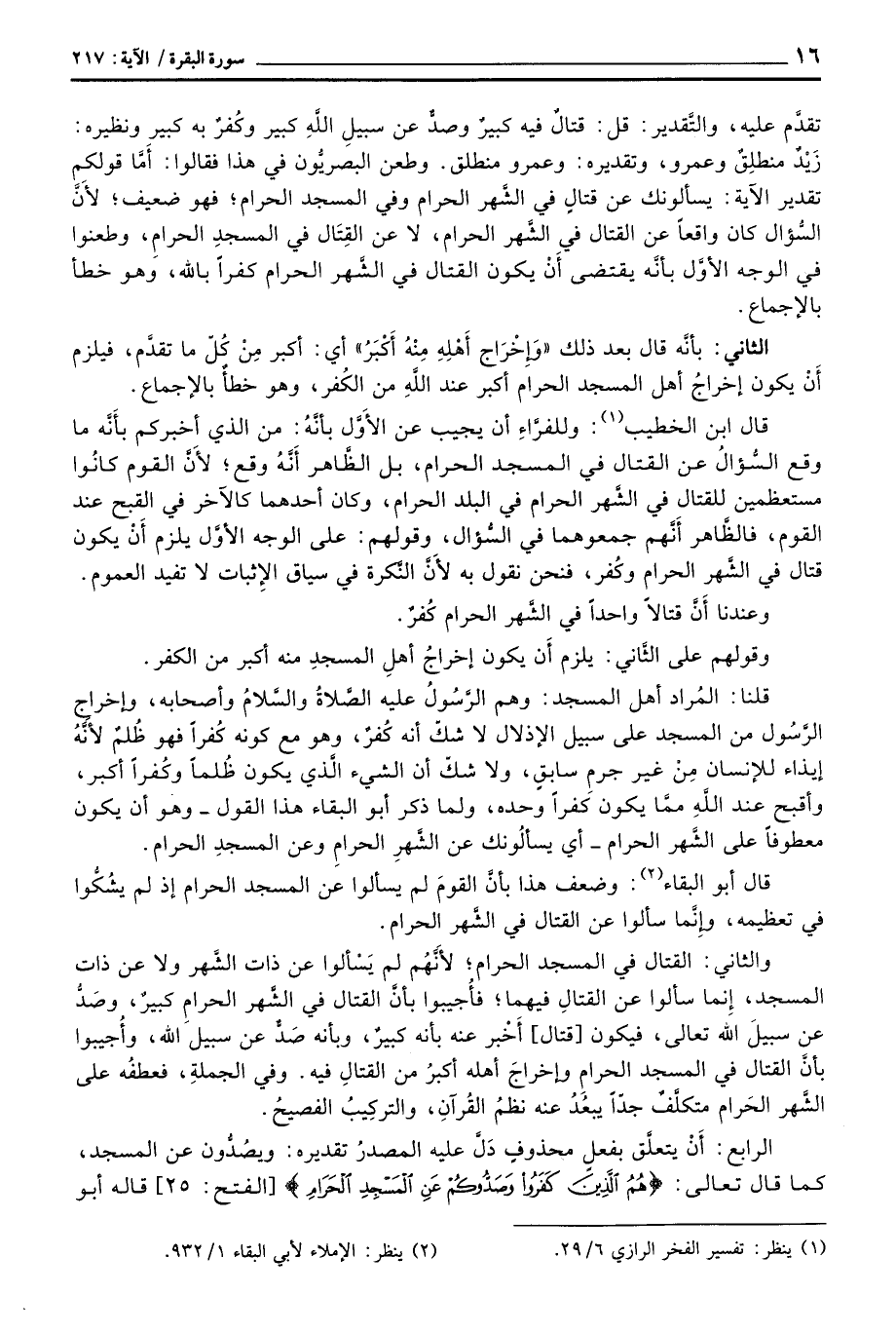 والثاني: القتال في المسجد الحرام؛ لأَنَّهُم لم يَسْأَلوا عن ذات الشَّهر ولا عن ذات المسجد، إِنما سألوا عن القتالِ فيهما؛ فأُجيبوا بأنَّ القتال في الشَّهر الحرامِ كبيرٌ، وصَدٌّ عن سبيلِ الله تعالى، فيكون [قتال] أَخْبر عنه بأنه كبيرٌ، وبأنه صَدٌّ عن سبيل الله، وأُجيبوا بأنَّ القتال في المسجد الحرامِ وإِخراجَ أهله أكبرُ من القتالِ فيه. وفي الجملةِ، فعطفُه على الشَّهر الحَرام متكلَّفٌ جدّاً يبعُدُ عنه نظمُ القُرآنِ، والتركِيبُ الفصيحُ.