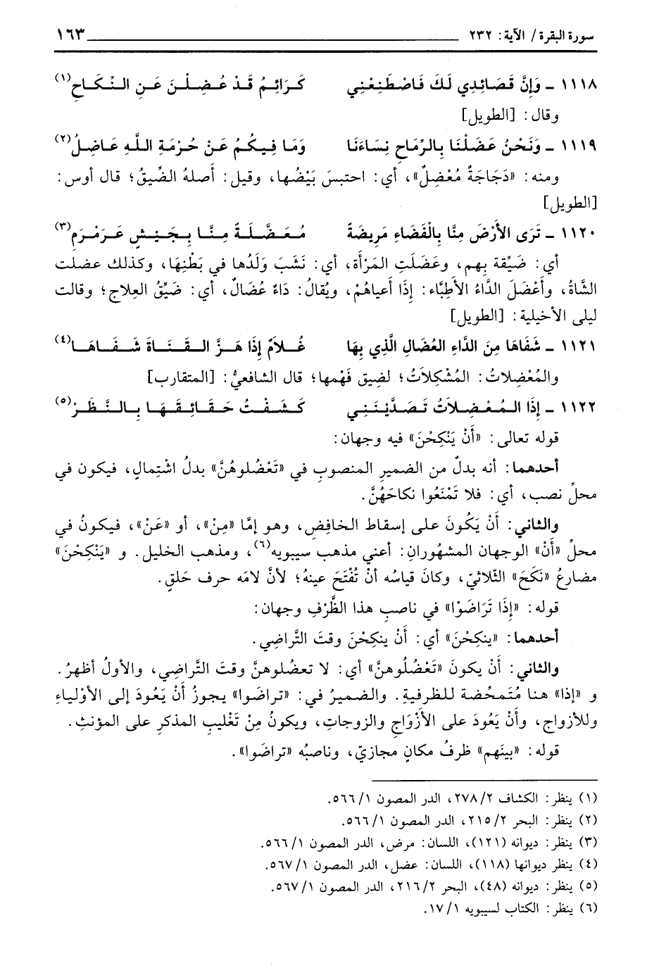 والثاني: أَنْ يكونَ «تَعْضُلُوهنَّ» أي: لا تعضُلوهنَّ وقتَ التَّراضِي، والأولُ أظهرُ. و «إذا» هنا مُتَمحِّضَة للظرفيةِ. والضميرُ في «تراضَوا» يجوزُ أَنْ يَعُودَ إلى الأوْلياءِ وللأزواج، وأَنْ يَعُودَ على الأَزْوَاجِ والزوجاتِ، ويكونُ مِنْ تَغْلِيبِ المذكرِ على المؤنثِ.