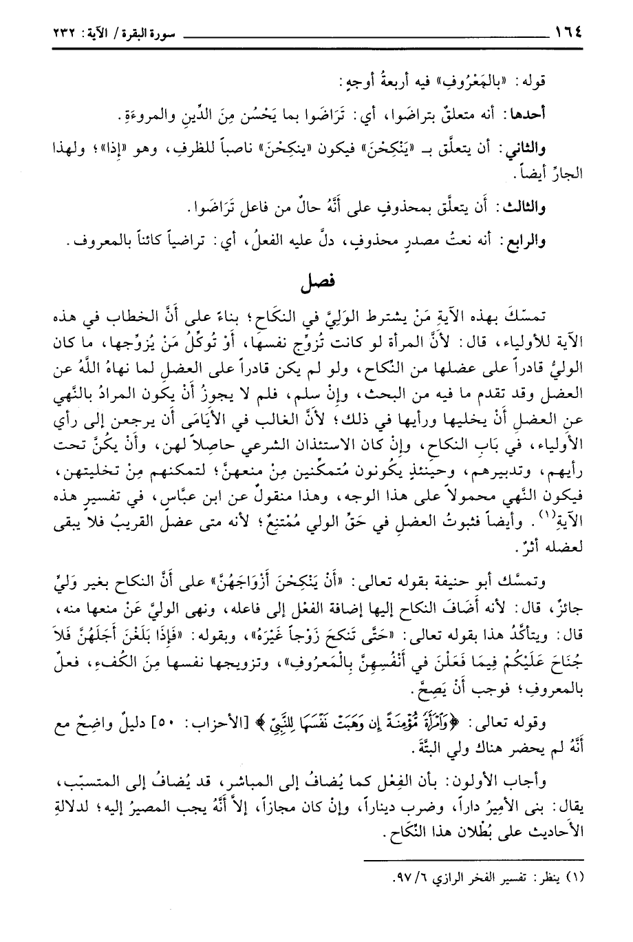 تمسّكَ بهذه الآيةِ مَنْ يشترط الوَلِيَّ في النكَاحِ؛ بناءَ على أَنَّ الخطاب في هذه الآية للأولياء، قال: لأَنَّ المرأة لو كانت تُزوِّج نفسها، أَوْ تُوكِّلُ مَنْ يُزوِّجها، ما كان الوليُّ قادراً على عضلها من النِّكاح، ولو لم يكن قادراً على العضلِ لما نهاهُ اللهُ عن العضل وقد تقدم ما فيه من البحث، وإِنْ سلم، فلم لا يجوزُ أَنْ يكون المرادُ بالنَّهي عنِ العضلِ أَنْ يخليها ورأيها في ذلك؛ لأَنَّ الغالب في الأَيَامَى أَن يرجعن إلى رأي الأَولياء، في بَابِ النكاحِ، وإِنْ كان الاستئذان الشرعي حاصِلاً لهن، وأَنْ يكُنَّ تحت رأيهم، وتدبيرهم، وحينئذٍ يكُونون مُتمكِّنين مِنْ منعهنَّ؛ لتمكنهم مِنْ تخليتهن، فيكون النَّهي محمولاً على هذا الوجه، وهذا منقولٌ عن ابن عبَّاسٍ، في تفسير هذه الآيةِ. وأيضاً فثبوتُ العضلِ في حَقِّ الولي مُمْتَنِعٌ؛ لأنه متى عضل القريبُ فلا يبقى لعضله أثرٌ.