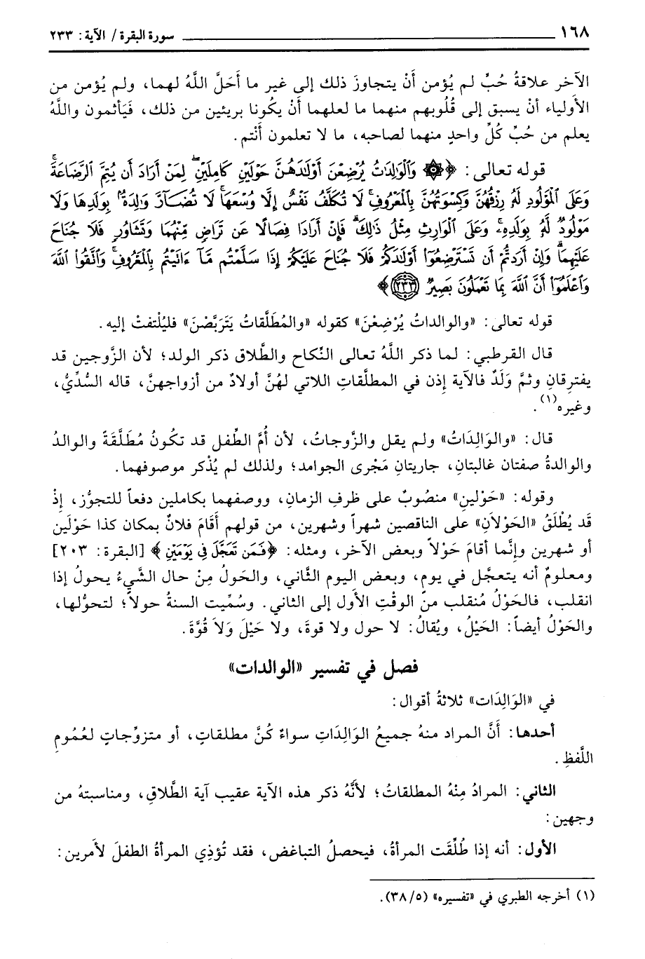 قال القرطبي: لما ذكر اللهُ تعالى النِّكاح والطَّلاق ذكر الولد؛ لأن الزَّوجين قد يفترِقانِ وثمَّ وَلَدٌ فالآية إِذن في المطلَّقاتِ اللاتي لهُنَّ أولادٌ من أزواجهنَّ، قاله السُّدِّيُّ، وغيره.