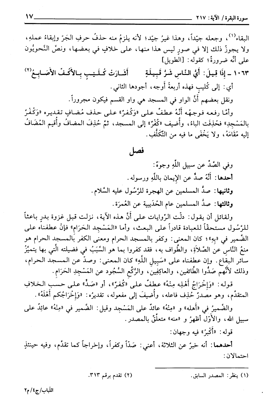 ولقائل أن يقول: دلّت الرَّوايات على أَنَّ هذه الآية، نزلت قبل غزوة بدرٍ باعثاً للرَّسُول مستحقّاً للعبادة قادراً على البعث، وأما «المَسْجِد الحَرَامِ» فإِنْ عطفناه على الضَّمير في «بِهِ» ؛ كان المعنى: وكفر بالمسجد الحرام ومعنى الكفر بالمسجد الحرام هو منعُ النَّاسِ عن الصَّلاَةِ، والطَّواف به، فقد كفروا بما هو السَّبَبُ في فضيلته الَّتي بها يتميَّزُ سائر البقاع.