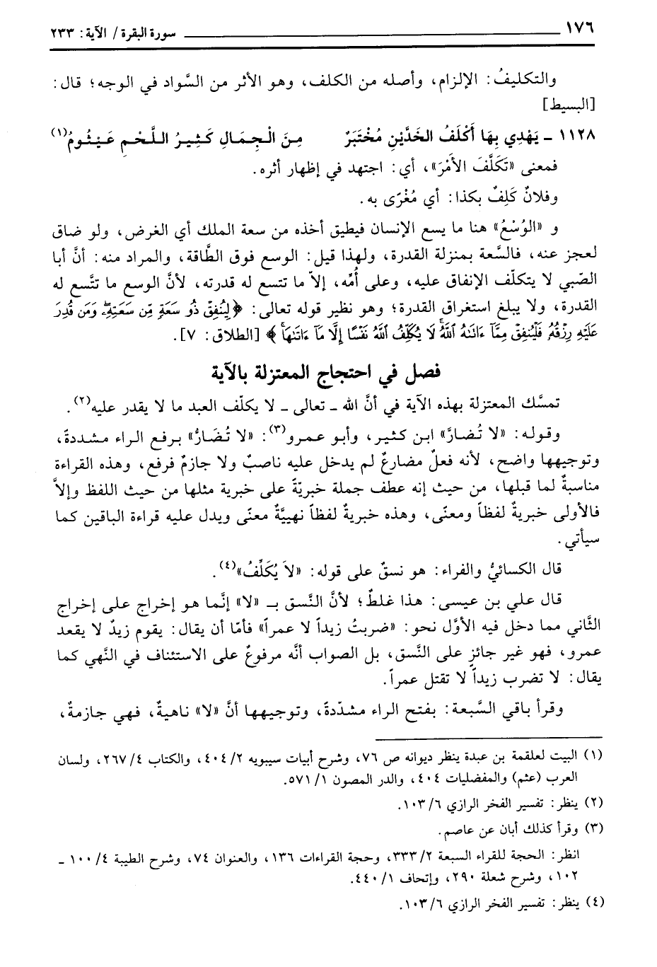 تمسَّك المعتزلة بهذه الآية في أنَّ الله - تعالى - لا يكلّف العبد ما لا يقدر عليه.