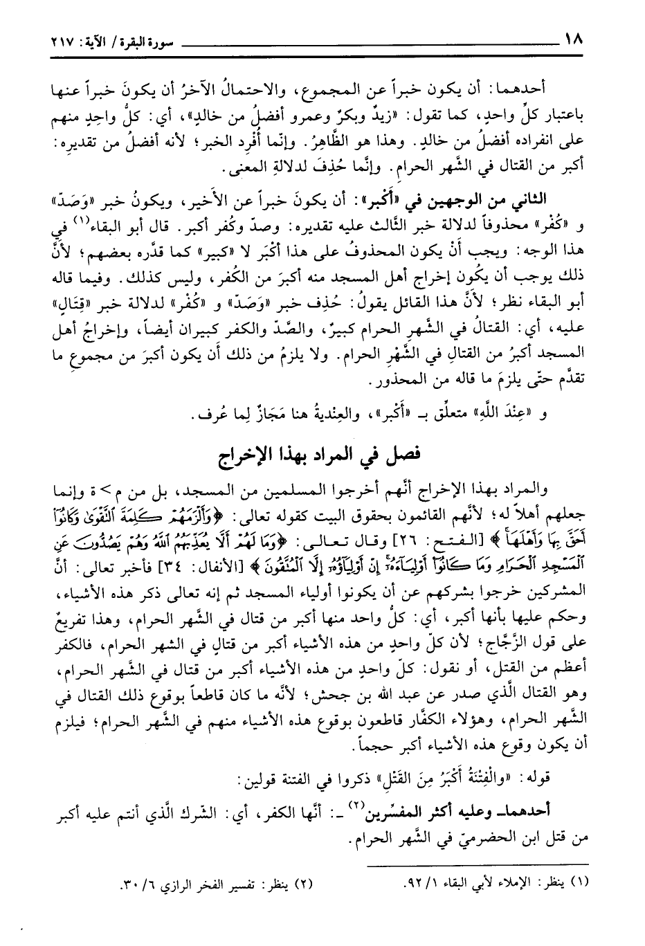 أحدهما: أن يكون خبراً عن المجموع، والاحتمالُ الآخرُ أن يكونض خبراً عنها باعتبار كلِّ واحدٍ، كما تقول: «زيدٌ وبكرٌ وعمرو أفضلُ من خالدٍ» ، أي: كلُّ واحِدٍ منهم على انفراده أفضلُ من خالدٍ. وهذا هو الظَّاهِرُ. وإِنّما أُفْرِدَ الخبر؛ لأنه أفضلُ من تقديرِه: أكبر من القتال في الشَّهر الحرامِ. وإنَّما حُذِفَ لدلالةِ المعنى.