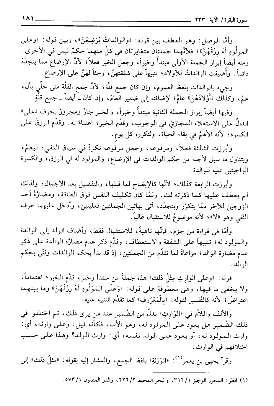 وأمَّا في قراءة من جزم، فإنَّها ناهيةٌ، للاستقبال فقط، وأضاف الولد إلى الوالدة والمولود له؛ تنبيهاً على الشفقة والاستعطاف، وقدَّم ذكر عدم مضارَّة الوالدة على ذكر عدم مضارة الوالد؛ مراعاةً لما تقدَّم من الجملتين، إذ قد بدأ بحكم الوالدات وثنَّى بحكم الوالد.