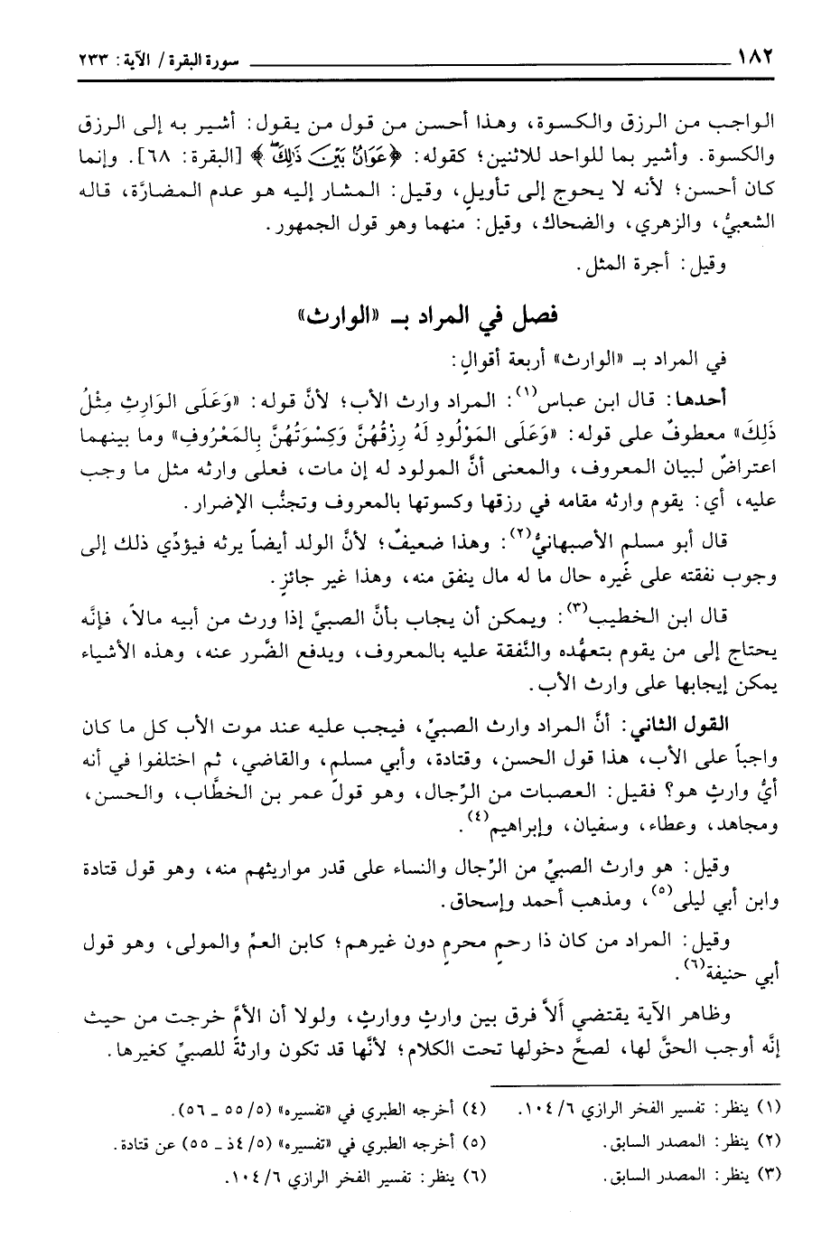 أحدها: قال ابن عباس: المراد وارث الأب؛ لأنَّ قوله: {وَعَلَى الوارث مِثْلُ ذلك} معطوفٌ على قوله: {وَعلَى المولود لَهُ رِزْقُهُنَّ وَكِسْوَتُهُنَّ بالمعروف} وما بينهما اعتراضٌ لبيان المعروف، والمعنى أنَّ المولود له إن مات، فعلى وارثه مثل ما وجب عليه، أي: يقوم وارثه مقامه في رزقها وكسوتها بالمعروف وتجنُّب الإضرار.