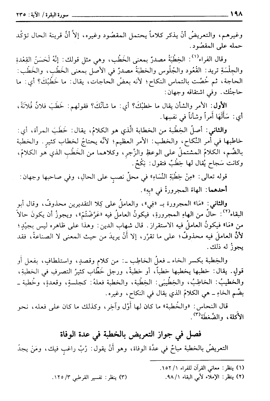 وقال الفراء: الخِطْبَةُ مصدرٌ بمعنى الخَطْب، وهي مثل قولك: إِنَّه لَحَسَنُ القِعْدةِ والجِلْسَةِ تريد: القُعُود والجُلُوس والخطبَةُ مصدرٌ في الأصل بمعنى الخَطْبِ، والخَطْب: الحاجة، ثم خُصَّت بالتماس النكاح؛ لأنه بعضُ الحاجات، يقال: ما خَطْبُكَ؟ أي: ما حاجتُك. وفي اشتقاقه وجهان: