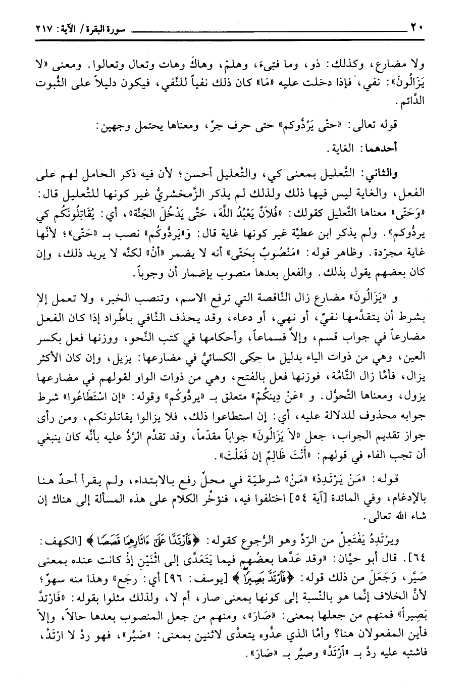 والثاني: التَّعليل بمعنى كي، والتَّعليل أحسن؛ لأن فيه ذكر الحامل لهم على الفعل، والغاية ليس فيها ذلك ولذلك لم يذكر الزَّمخشريُّ غير كونها للتَّعليل قال: «وَحَتّى» معناها التَّعليل كقولك: «فُلاَنٌ يُعْبُدُ اللهَ، حَتَّى يَدْخُلَ الجَنَّة» ، أي يُقَاتِلُونَكُم كي يردُّوكم «. ولم يذكر ابن عطيَّة غير كونها غاية قال:» وَ «يَرُدُّوكُم» نصب ب «حَتّى» ؛ لأنَّها غاية محرّدة. وظاهر قوله: «مَنْصُوبٌ بِحَتّى» أنه لا يضمر «أنْ» لكنَّه لا يريد ذلك، وإن كان بعضهم يقول بذلك. والفعل بعدها منصوب بإضمار أن وجوباً.