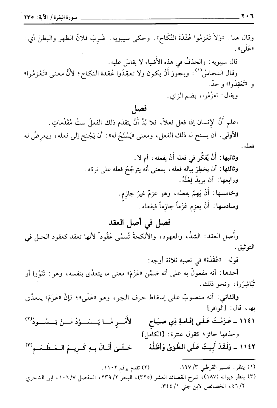 والثاني: أنه منصوبٌ على إسقاط حرف الجر، وهو «عَلَى» ؛ فإنَّ «عَزَمَ» يتعدَّى بها، قال: [الوافر]
