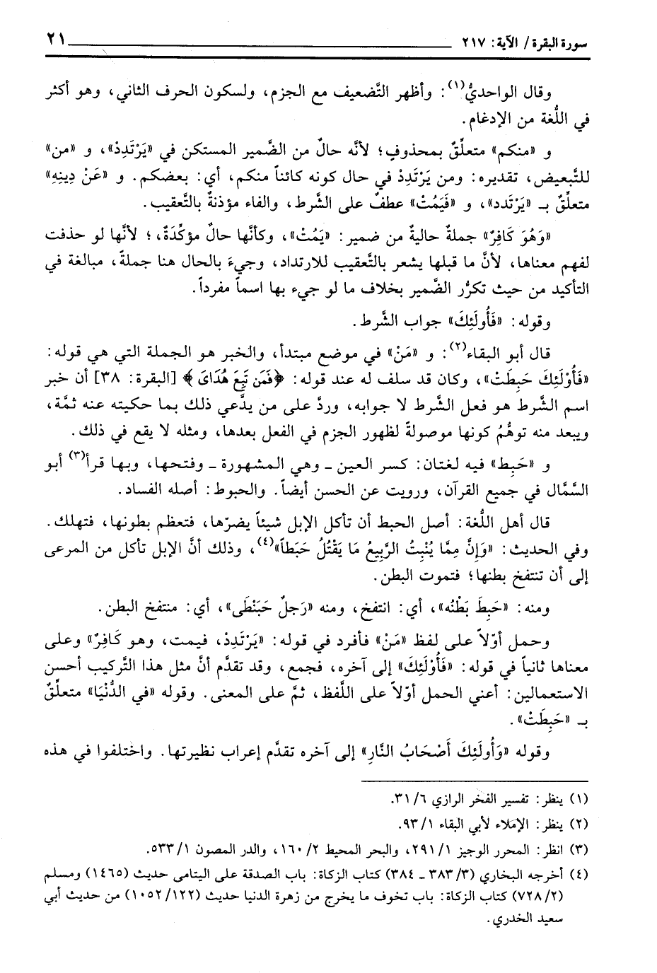 وحمل أوّلاً على لفظ «مَنْ» فأفرد في قوله: «يَرٍْتَدِدْ، فيمت، وهو كَافِرٌ» وعلى معناها ثانياً في قوله: «فَأُولَئِكَ» إلى آخره، فجمع، وقد تقدَّم أنَّ مثل هذا التَّركيب أحسن الاستعمالين: أعني الحمل أوّلاً على اللَّفظ، ثمَّ على المعنى. وقوله «في الدُّنْيَا» متعلِّقٌ ب «حَبِطَتْ» .