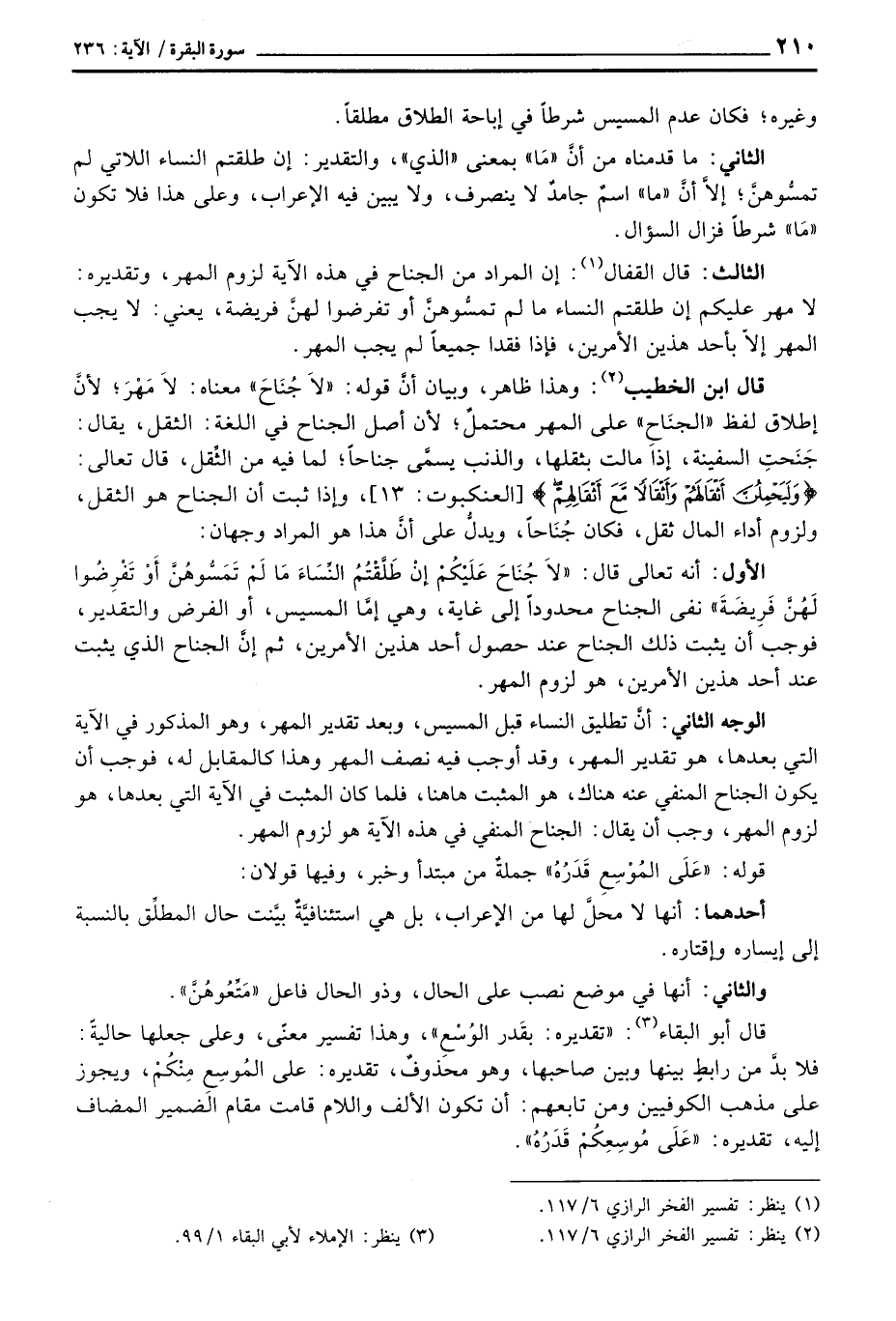 الوجه الثاني: أنَّ تطليق النساء قبل المسيس، وبعد تقدير المهر، وهو المذكور في الآية التي بعدها، هو تقدير المهر، وقد أوجب فيه نصف المهر وهذا كالمقابل له، فوجب أن يكون الجناح المنفي عنه هناك، هو المثبت ها هنا، فلما كان المثبت في الآية التي بعدها، هو لزوم المهر، وجب أن يقال: الجناح المنفي في هذه الآية هو لزوم المهر.