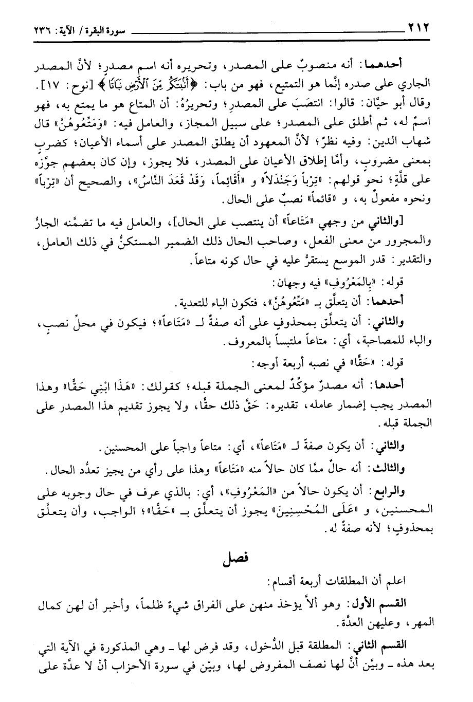 أحدهما: أنه منصوبٌ على المصدر، وتحريره أنه اسم مصدرٍ؛ لأنَّ المصدر الجاري على صدره إنَّما هو التمتيع، فهو من باب: {أَنبَتَكُمْ مِّنَ الأرض نَبَاتاً} [نوح: 17] . وقال أبو حيَّان: قالوا: انتصَبَ على المصدرِ؛ وتحريرُهُ: أن المتاع هو ما يمتع به، فهو اسمٌ له، ثم أطلق على المصدر؛ على سبيل المجاز، والعامل فيه: «وَمَتِّعُوهُنَّ» قال شهاب الدين: وفيه نظرٌ؛ لأنَّ المعهود أن يطلق المصدر على أسماء الأعيان؛ كضربٍ بمعنى مضروبٍ، وأمَّا إطلاق الأعيان على المصدر، فلا يجوز، وإن كان بعضهم جوَّزه على قلَّةٍ؛ نحو قولهم: «تِرْباً وَجَنْدَلاً» و «أَقَائِماً، وَقَدْ قَعَدَ النَّاسُ» ، والصحيح أن «تِرْباً» ونحوه مفعولٌ به، و «قائماً نصبٌ على الحال.