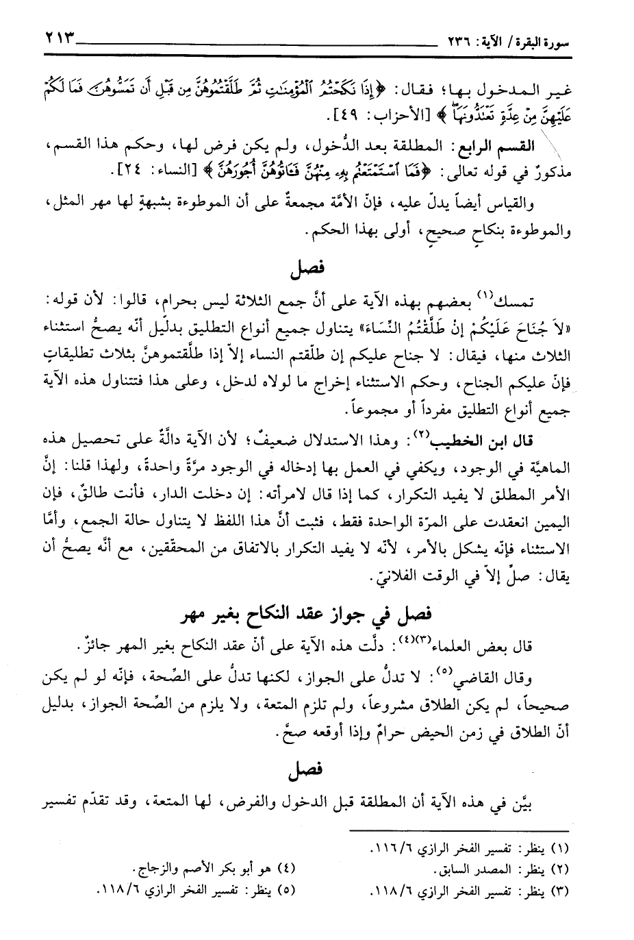 بيَّن في هذه الآية أن المطلقة قبل الدخول والفرض، لها المتعة، وقد تقدّم تفسير «
