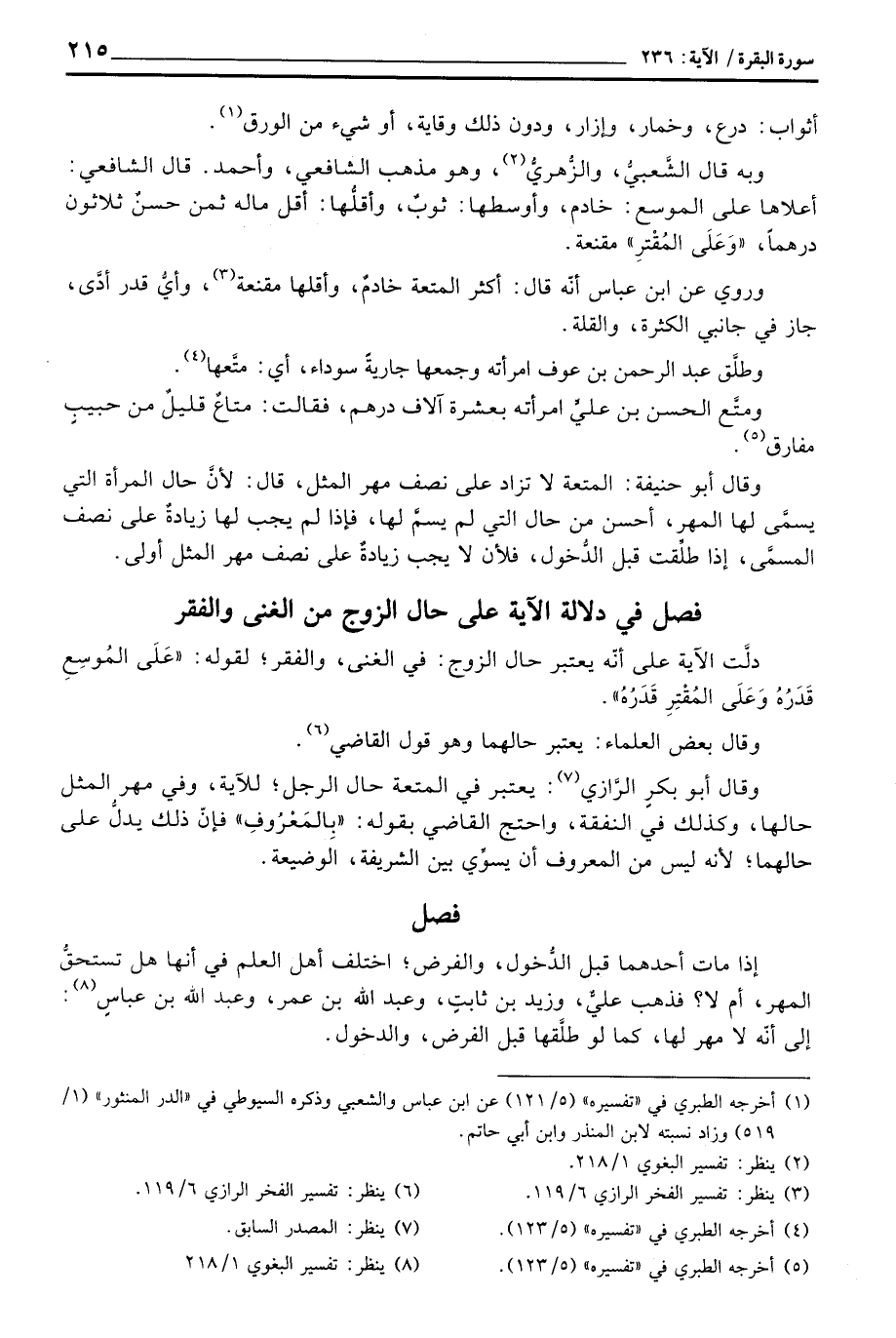 وقال أبو بكرٍ الرَّازي: يعتبر في المتعة حال الرجل؛ للآية، وفي مهر المثل حالها، وكذلك في النفقة، واحتج القاضي بقوله: «بالمعروف» فإنّ ذلك يدلُّ على حالهما؛ لأنه ليس من المعروف أن يسوِّي بين الشريفة، الوضيعة.
