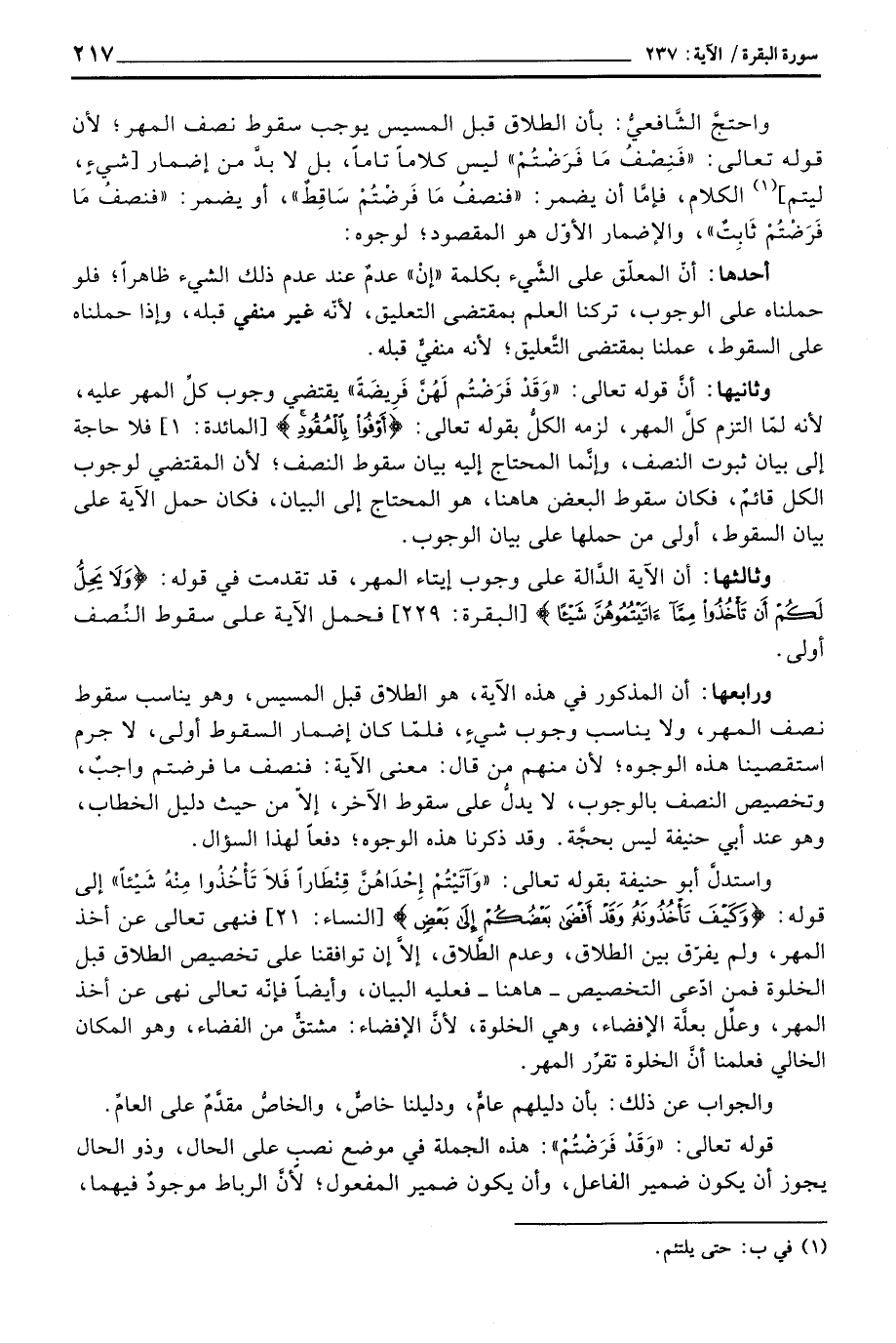 ورابعها: أن المذكور في هذه الآية، هو الطلاق قبل المسيس، وهو يناسب سقوط نصف المهر، ولا يناسب وجوب شيءٍ، فلمّا كان إضمار السقوط أولى، لا جرم استقصينا هذه الوجوه؛ لأن منهم من قال: معنى الآية: فنصف ما فرضتم واجبٌ، وتخصيص النصف بالوجوب، لا يدلُّ على سقوط الآخر، إلاّ من حيث دليل الخطاب، وهو عند أبي حنيفة ليس بحجَّة. وقد ذكرنا هذه الوجوه؛ دفعاً لهذا السؤال.
