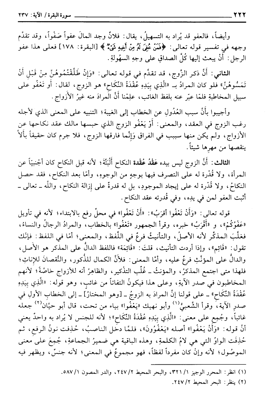 الثاني: أَنَّ ذكر الزَّوج، قد تقدَّم في قوله تعالى: {وَإِن طَلَّقْتُمُوهُنَّ مِن قَبْلِ أَن تَمَسُّوهُنَّ} فلو كان المرادُ ب {الذي بِيَدِهِ عُقْدَةُ النكاح} هو الزوج، لقال: أَوْ تَعْفُو على سبيل المخاطبةِ فلمَّا عبّر عنه بلفظ الغائب، علِمْنا الغائب، علِمْنا أَنَّ المرادَ منه غيرُ الأَزواج.