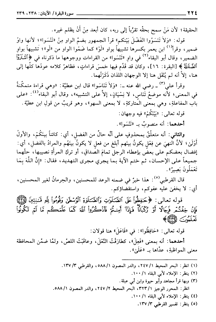 والثاني: أنه متعلِّقٌ بمحذوفٍ على أنَّه حالٌ من الفضل، أي كائناً بينَكثمْ، والأولُ أَوْلَى؛ لأنَّ النهيَ عن فِعْلٍ يكونُ بينَهم أبلغ من فعلٍ لا يكونُ بينَهُم والمرادُ بالفضلِ، أي: إفضال بعضكم لى بعض بإعطاء الرجل تمامَ الصداقِ، أو تركِ المرأَةِ نصيبها، حثَّهما جميعاً على الإحسان، ثم ختم الآية بما يجري مجرى التهديد، فقال: {إِنَّ الله بِمَا تَعْمَلُونَ بَصِيرٌ} .