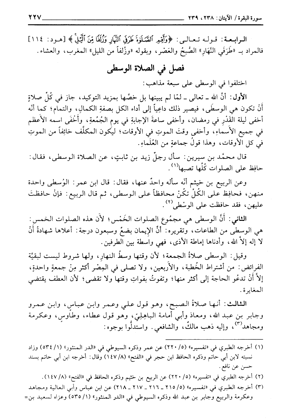 الثالث: أنها صلاةُ الصبح، وهو قول علي وعمر وابن عباس، وابن عمرو وجابر بن عبد الله، ومعاذ وأبي أمامة الباهِليّ، وهو قول عطاء، وطاوسٍ، وعكرمة ومجاهد، وإليه ذهب مالكٌ، والشافعي. واستدلُّوا بوجوه: