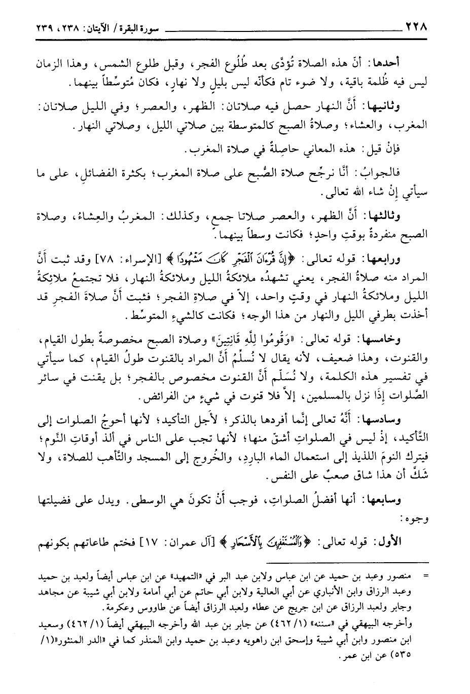وخامسها: قوله تعالى: {وَقُومُواْ للَّهِ قَانِتِينَ} وصلاة الصبح مخصوصةٌ بطول القيام، والقنوت، وهذا ضعيف، لأنه يقال لا نُسلِّمُ أَنَّ المراد بالقنوت طولُ القيام، كما سيأتي في تفسير هذه الكلمة، ولا نُسَلّم أَنَّ القنوت مخصوص بالفجر؛ بل يقنت في سائر الصَّلوات إِذَا نزل بالمسلمين، إِلاَّ فلا قنوت في شيءٍ من الفرائض.