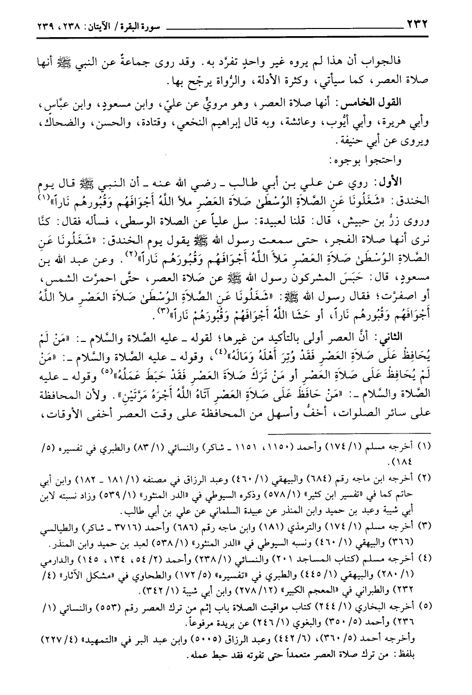 القول الخامس: أنها صلاة العصر، وهو مرويٌّ عن عليّ، وابن مسعودٍ، وابن عبَّاسٍ، وأبي هريرة، وأبي أيُّوب، وعائشة، وبه قال إبراهيم النخعي، وقتادة، والحسن، والضحاك، ويروى عن أبي حنيفة.