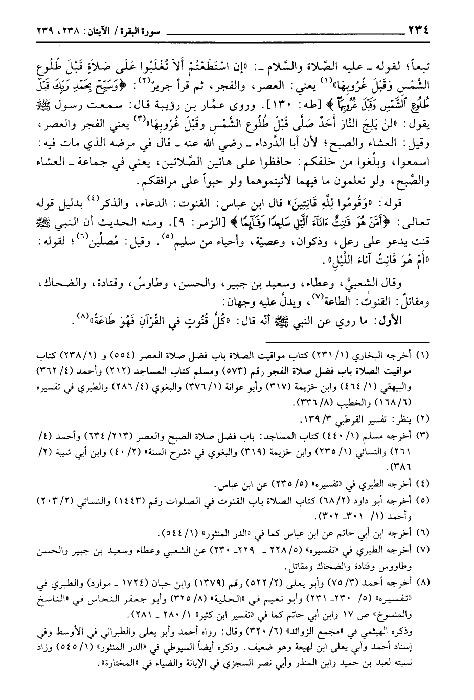وقال الشعبيُّ، وعطاء، وسعيد بن جبير، والحسن، وطاوسٌ، وقتادة، والضحاك، ومقاتلٌ: القنوت: الطاعة، ويدلُّ عليه وجهان: