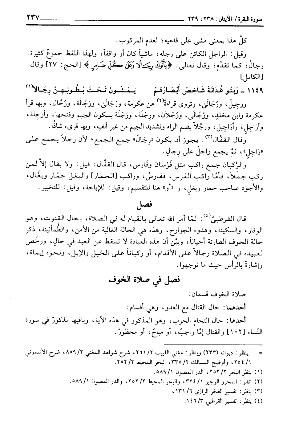 قال القرطبيُّ: لمّا أمر الله تعالى بالقيام له في الصلاة، بحال القنوت، وهو الوقار، والسكينة، وهدوء الجوارح، وهذه هي الحالة الغالبة من الأمن، والطُّمأنينة، ذكر حالة الخوف الطارئة أحياناً، وبيَّن أن هذه العبادة لا تسقط عن العبد في حالٍ، ورخَّص لعبيده في الصلاة رجالاً على الأقدام، أو ركباناً على الخيل والإبل، ونحوه إيماءً، وإشارةً بالرأس حيث ما توجهوا.