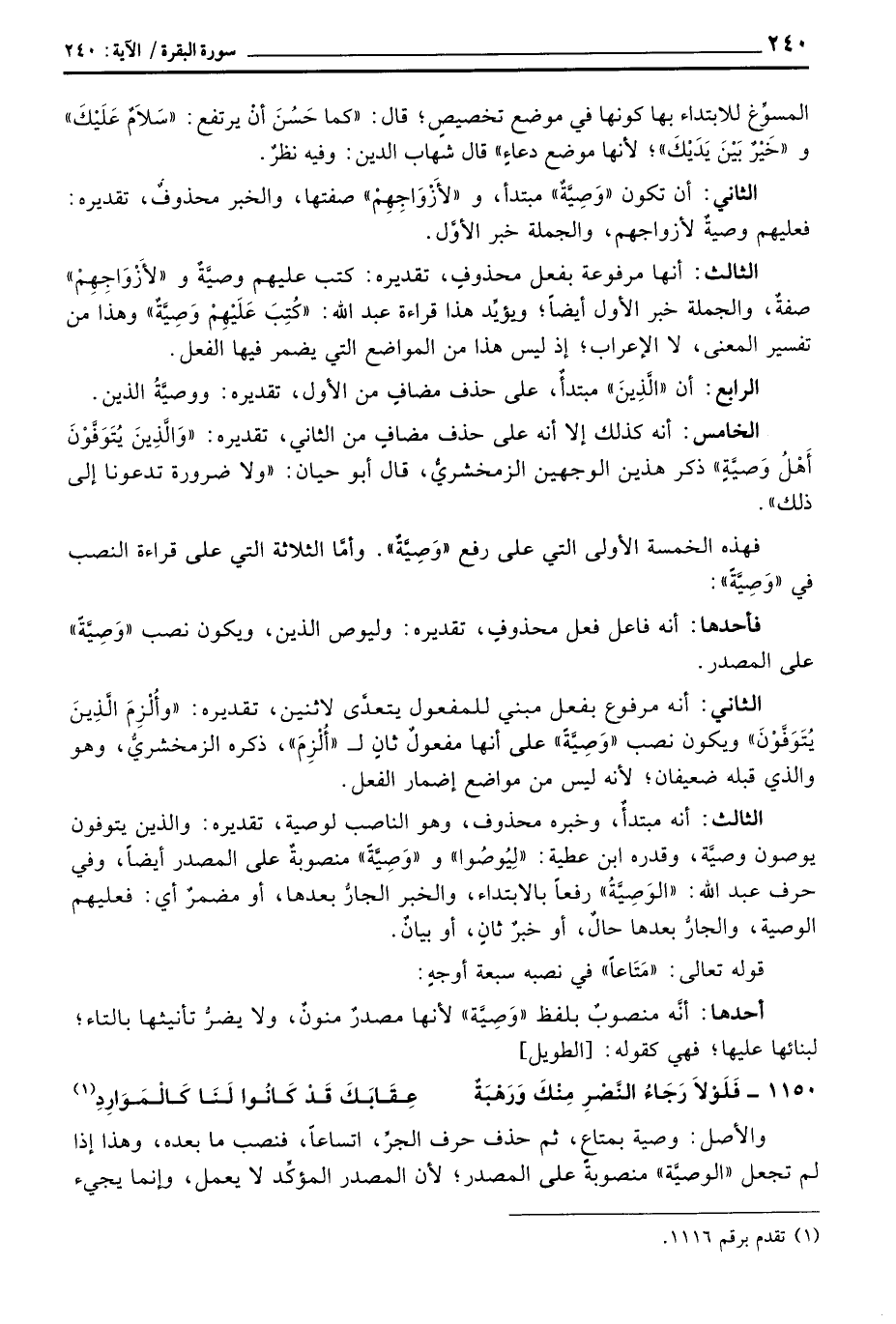 الثالث: أنها مرفوعة بفعل محذوفٍ، تقديره: كتب عليهم وصيَّةٌ و «لأَزْوَاجِهِمْ» صفةٌ، والجملة خبر الأول أيضاً؛ ويؤيِّد هذا قراءة عبد الله: «كُتِبَ عَلَيْهِمْ وَصِيَّةٌ» وهذا من تفسير المعنى، لا الإعراب؛ إذ ليس هذا من المواضع التي يضمر فيها الفعل.