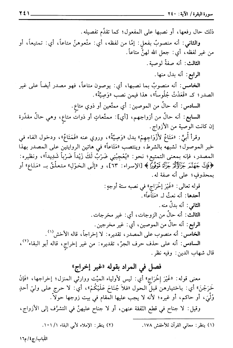 وقرأ أُبيٌّ: «مَتَاعٌ لأَزْوَاجِهِمْ» بدل «وَصِيَّةٌ» ، وروي عنه «فَمَتَاعٌ» ، ودخول الفاء في خبر الموصول؛ لشبهه بالشرط، وينتصب «مَتَاعاً» في هاتين الروايتين على المصدر بهذا المصدر، فإنه بمعنى التمتيع؛ نحو: «يُعْجِبُنِي ضَرْبٌ لَكَ ضَرْباً شَدِيداً» ، ونظيره: {قَالَ اذهب فَمَن تَبِعَكَ مِنْهُمْ فَإِنَّ جَهَنَّمَ جَزَآؤُكُمْ جَزَاءً مَّوْفُوراً} [الإسراء: 63] ، و «إِلَى الحَوْلِ» متعلِّقٌ ب «مَتَاع» أو بمحذوفٍ؛ على أنه صفة له.