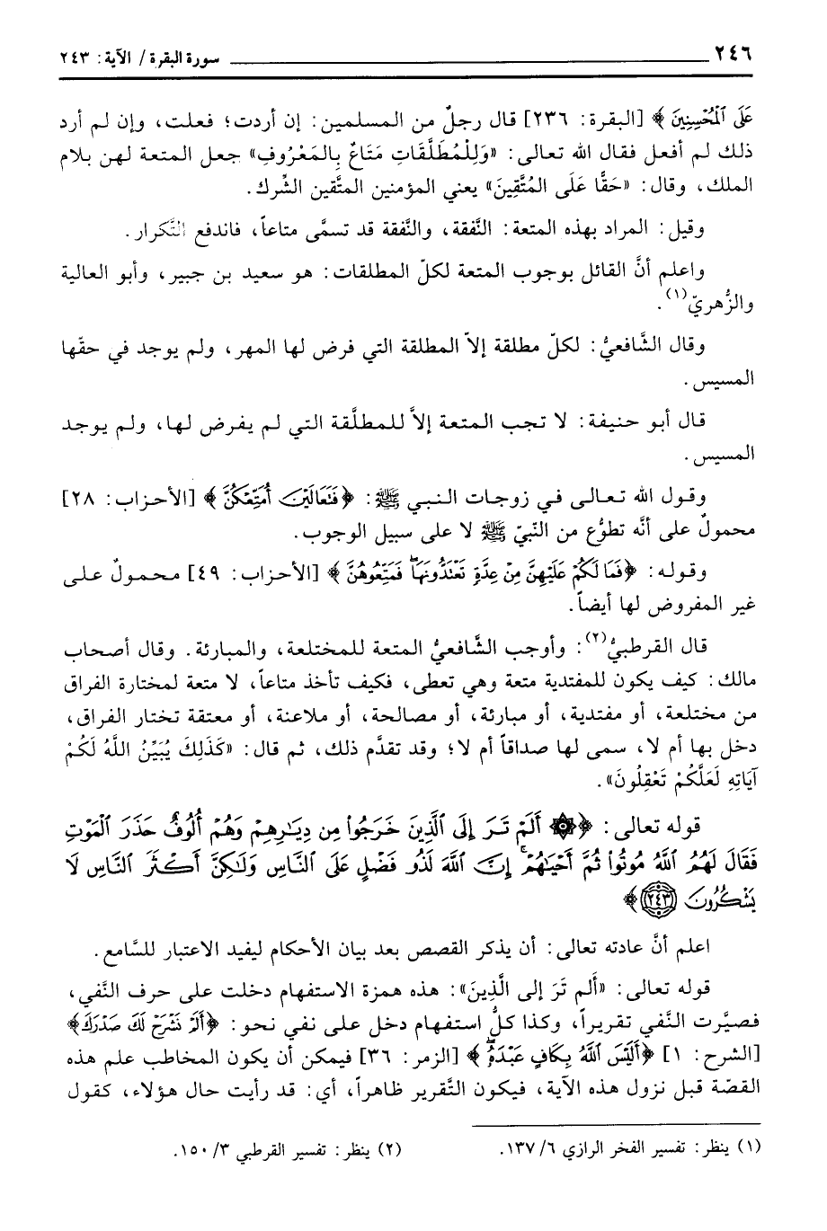 عَلَى الْمُحْسِنِينَ} [البقرة: 236] قال رجلٌ من المسلمين: إن أردت؛ فعلت، وإن لم أرد ذلك لم أفعل فقال الله تعالى: {وَلِلْمُطَلَّقَاتِ مَتَاعٌ بالمعروف} جعل المتعة لهن بلام الملك، وقال: {حَقّاً عَلَى المتقين} يعنى المؤمنين المتَّقين الشِّرك.