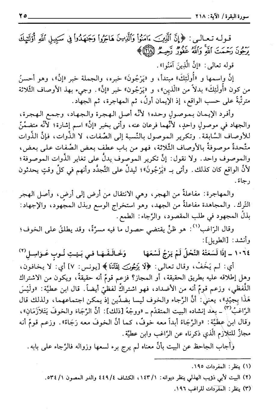وأفرد الإيمان بموصولٍ وحده؛ لأنَّه أصل الهجرة والجهاد، وجمع الهجرة، والجهاد في موصولٍ واحدٍ، لأنَّهما فرعان عنه، وأتى بخر «إنَّ» اسم إشارة؛ لأنَّه متضمِّنٌ للأوصاف السَّابقة. وتكرير الموصول بالنِّسبة إلى الصِّفات، لا الذَّوات، فإنَّ الذَّوات متَّحدةٌ موصوفةٌ بالأوصاف الثَّلاثة، فهو من باب عطف بعض الصِّفات على بعض، والموصوف واحد. ولا نقول: إنَّ تكرير الموصوف يدلُّ على تغير الذَّوات الموصوفة؛ لأنَّ الواقع كان كذلك. وأتى ب «يَرءجُونَ» ؛ ليدَّ على التَّجدُّد وأنهم في كلِّ وقتٍ يحدثون رجاءً.