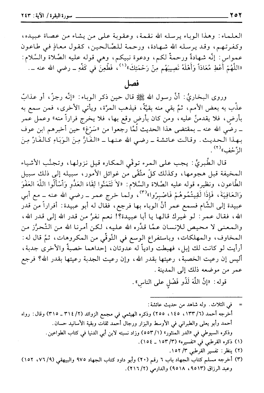 قال الطَّبريُّ: يجب على المرء توقّي المكاره قيل نزولها، وتجنُّب الأشياء المخيفة قبل هجومها، وكذلك كلّ متَّقًى من غوائل الأمور، سبيله إلى ذلك سبيل الطَّاعون، ونظيره قوله عليه الصَّلاة والسَّلام: «لاَ تَتَمَنَّوا لِقَاءَ العَدُوِّ وَاسْأَلُوا اللهَ العَفْوَ وَالعَافِيَةَ، فَإِذَا لَقِيتُمُوهُمْ فَاصْبِرُوا» ، ولما خرج عمر - رَضِيَ اللَّهُ عَنْه - مع أبي عبيدة إلى الشَّام فسمع عمر أنَّ الوباء بها فرجع، فقال له أبو عبيدة: أفراراً من قدر الله، فقال عمر: لو غيرك قالها يا أبا عبيدة؟! نعم نفرُّ من قدر الله إلى قدر الله، والمعنى لا محيص للإنسان عمَّا قدَّره الله عليه، لكن أمرنا الله من التَّتحرُّز من المخاوف، والمهلكات، وباستفراغ الوسع في التَّوقِّي من المكروهات، ثمَّ قال له: أرأيت لو كانت لك إبل، فهبطت وادياً له عدوتان، إحداهما خصبةٌ والأخرى جدبة، أليس إن رعيت الخصبة، رعيتها بقدر الله، وإن رعيت الجدبة رعيتها بقدر الله؟ فرجع عمر من موضعه ذلك إلى المدينة.