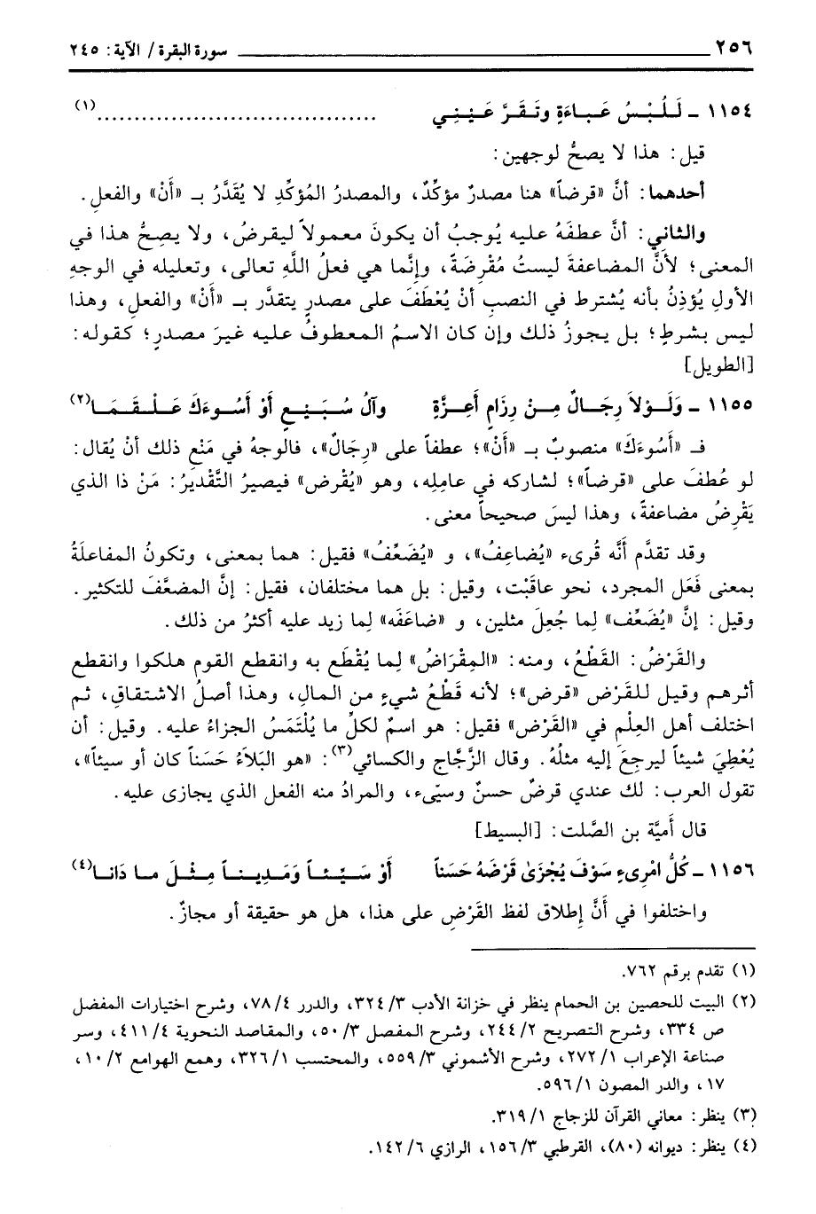 والثاني: أنَّ عطفَهُ عليه يُوجبُ أن يكونَ معمولاً ليقرضُ، ولا يصِحُّ هذا في المعنى؛ لأَنَّ المضاعفةَ ليستُ مُقْرِضَةً، وإِنَّما هي فعلُ اللهِ تعالى، وتعليله في الوجهِ الأولِ يُؤذِنُ بأنه يُشترط في النصبِ أنْ يُعْطَفَ على مصدرس يتقدَّر ب «أَنْ» والفعلِ، وهذا ليس بشرطٍ؛ بل يجوزُ ذلك وإن كان الاسمُ المعطوفُ عليه غيرَ مصدرٍ؛ كقوله: [الطويل]