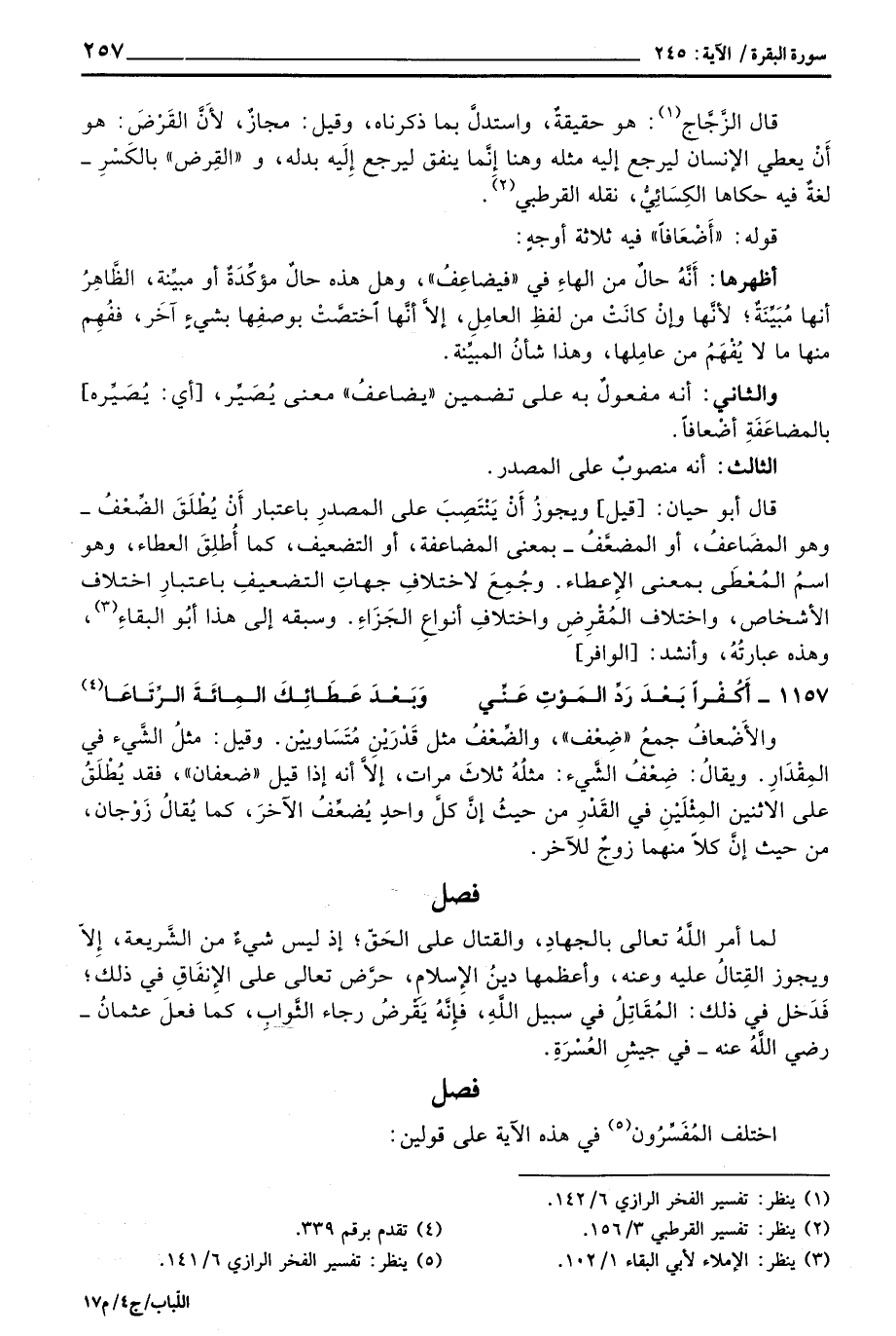 قال الزَّجَّاج: هو حقيقةٌ، واستدلَّ بما ذكرناه، وقيل: مجازٌ، لأَنَّ القَرْضَ: هو أَنْ يعطي الإنسان ليرجع إليه مثله وهنا إِنَّما ينفق ليرجع إِلَيه بدله، و «القِرض» بالكَسْرِ - لغةٌ فيه حكاها الكِسَائِيُّ، نقله القرطبي.