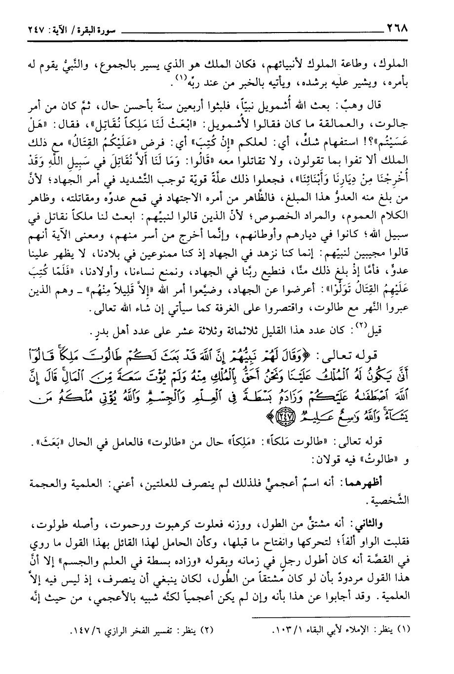 قوله تعالى: {طَالُوتَ مَلِكاً} : «مَلِكاً» حال من «طالوت» فالعامل في الحال «بَعَثَ» . و «طالوتُ» فيه قولان: