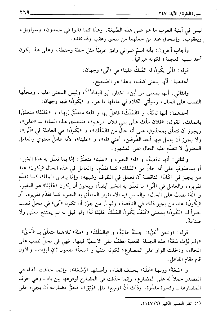 أحدهما: أنها تامَّةٌ، و «المُلْكُ» فاعلٌ بها و «له» متعلّقٌ [بها، و «عَلَيْنَا» متعلقٌ] بالملك، تقول: «فلان مَلَك على بني فلان أمرهم» ، فتتعدى هذه المادة ب «على» ، ويجوز أن تتعلَّق بمحذوفٍ على أنه حالٌ من «المُلْك» ، و «يَكُونُ» هي العاملة في «أنَّى» ، ولا يجوز أن يعمل فيها أحد الظَّرفين، أعني «له» ، و «علينا» ؛ لأنه عاملٌ معنوي والعامل المعنويُّ لا تتقدَّم عليه الحال على المشهور.