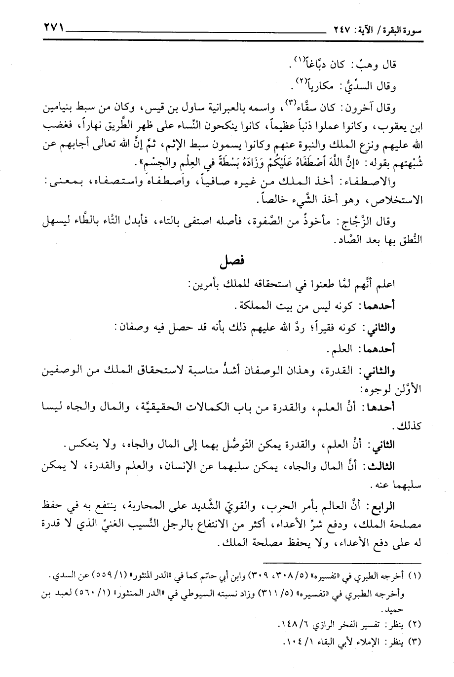 وقال آخرون: كان سقَّاء، واسمه بالعبرانية ساول بن قيس، وكان من سبط بنيامين ابن يعقوب، وكانوا عملوا ذنباً عظيماً، كانوا ينكحون النِّساء على ظهر الطَّريق نهاراً، فغضب الله عليهم ونزع الملك والنبوة عنهم وكانوا يسمون سبط الإثم، ثمَّ إنَّ الله تعالى أجابهم عن شُبْهتهم بقوله: {إِنَّ الله اصطفاه عَلَيْكُمْ وَزَادَهُ بَسْطَةً فِي العلم والجسم} .