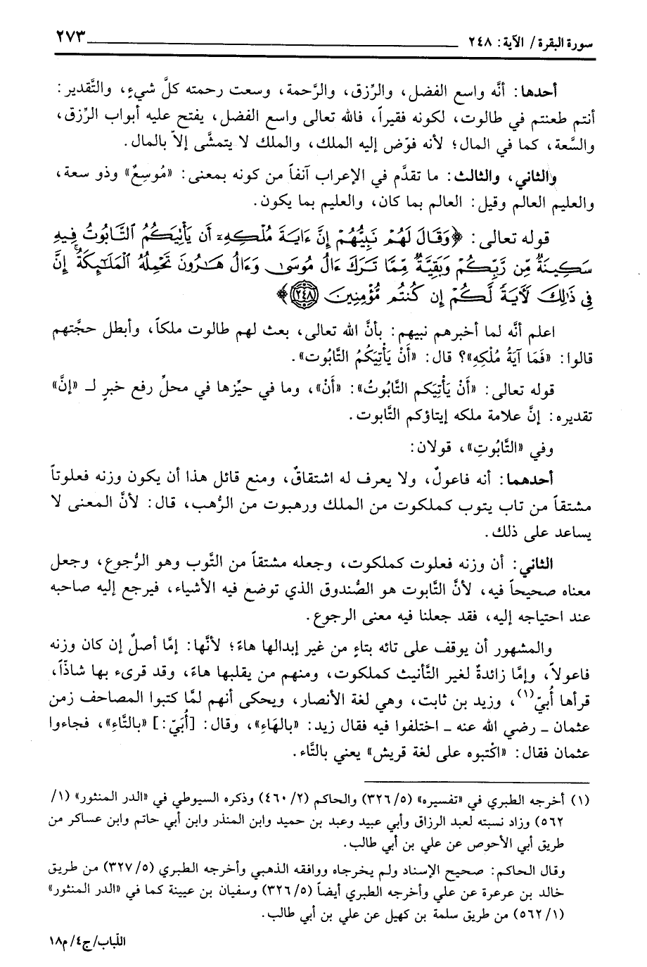 الثاني: أن وزنه فعلوت كملكوت، وجعله مشتقاً من التَّوب وهو الرُّجوع، وجعل معناه صحيحاً فيه، لأنَّ التَّابوت هو الصُّندوق الذي توضع فيه الأشياء، فيرجع إليه صاحبه عند احتياجه إليه، فقد جعلنا فيه معنى الرجوع.
